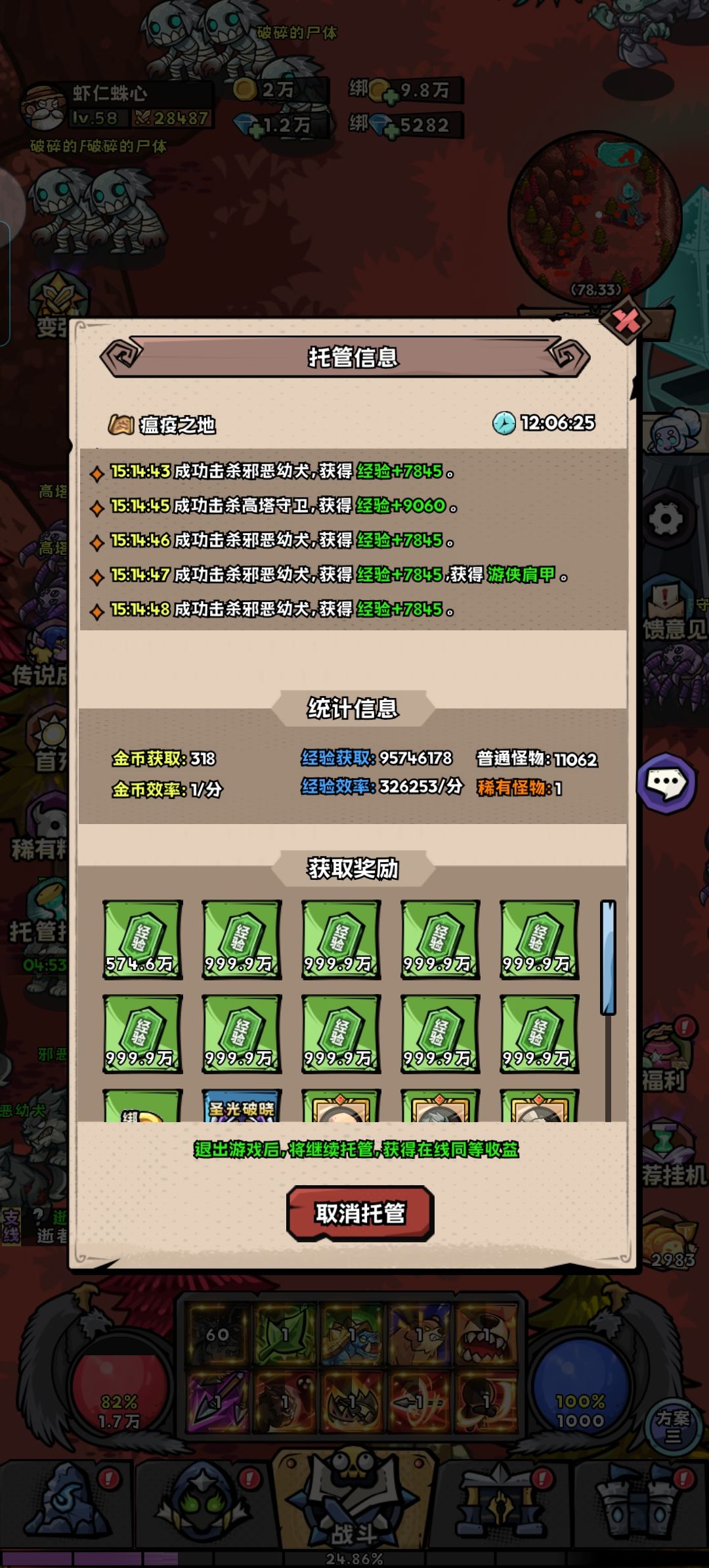 第二个位置是(78.33),这个位置是楼主越级刷装备是无意发现的,挂机难度比接肉高一点,但是比主唱简单很多,2万3左右的战力时效率有25万+,当时还是挺费药的,后面每天点点绿衬衫等级效率越来越高,直到现在32万+,可以一直挂到60了
