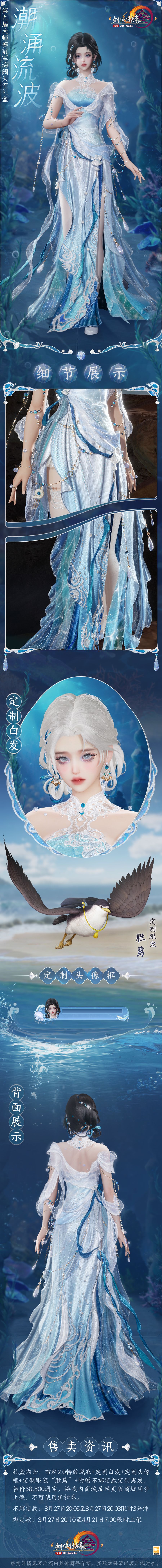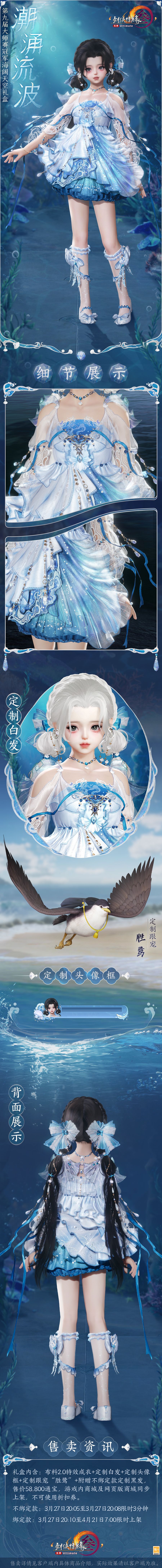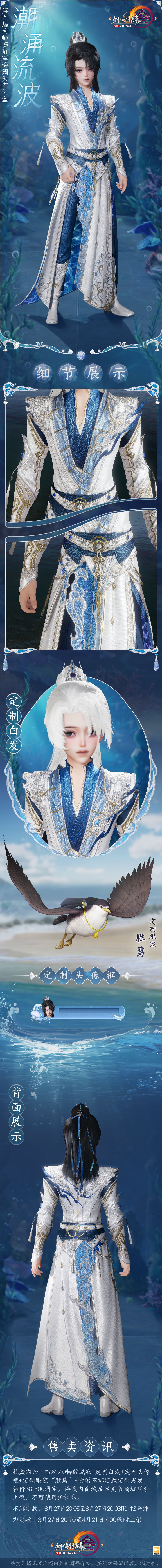鹏飞海浪,潮涌天来,《剑网3》第九届竞技大师赛冠军礼盒“潮涌流波”3月27日飒然来袭!服饰设计理念脱胎于“海阔天空”这一主题——衣袂交叠似浪花朵朵绽于碧海间,将潮波凝意于身,勾勒出“海阔”之浩瀚;皓白素雅若浮云,碧蓝清新似天穹,见证“天空”之飘逸,令人心旷神怡!探索性使用了下一代布料的动态物理碰撞技术,进一步降低鼓包问题,同时使用通用裸模,便于后续升级Body3.0。