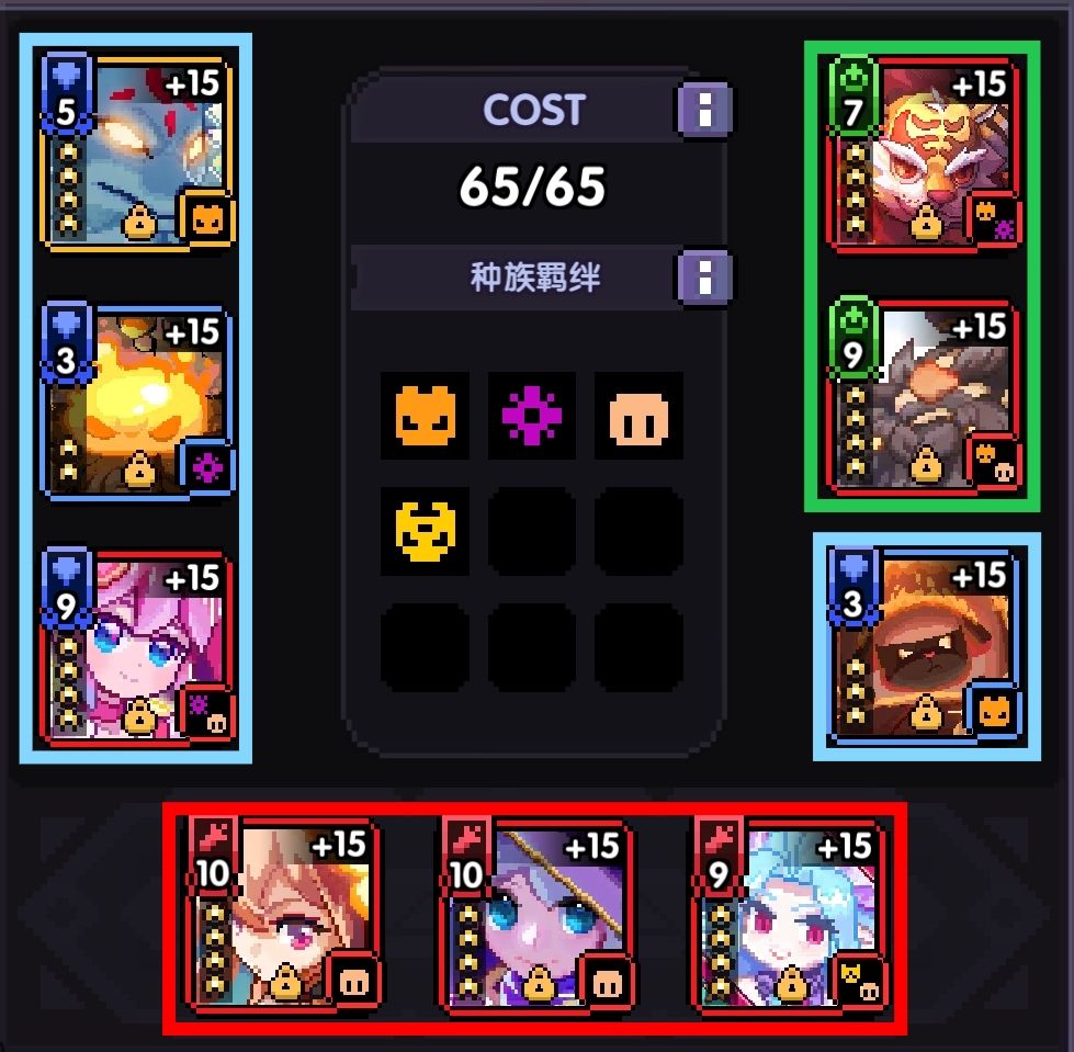 (ps.武器卡弓也好用,不想赌偶像可以直接把偶像换弓,小卡调整为5费。饰品卡祈也能带,但是会导致元素羁绊开不出来,主要还是根据自身魂卡情况调整。小卡去凑魔物、元素羁绊即可。装配防具卡时,将加百分比攻强多的卡优先装配在基础攻强高的部位上。)