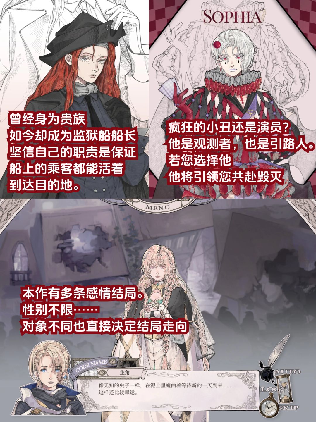另一个吸引人的地方在于游戏精彩的人物设计,从立绘上来说每个人物都绝美!从天而降不知道是敌是友的神秘黑皮少年,年少相知如今却形同陌路的美丽圣女发小(我最期待的角色,看起来真的很像危险的白切黑疯P谁能懂?),以及癫狂的只渴求真相的地下学者……目前来看都是可攻略的对象,但是选择不同的角色意味着不同的结局走向。而当身份揭秘之后,他们会有怎样的反应?你又是否做好了暴露的准备?