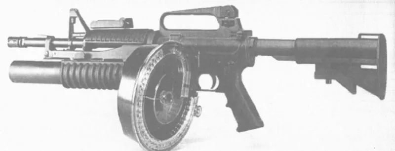 安装了弹鼓与M203榴弹发射器的早期试验型M4卡宾枪