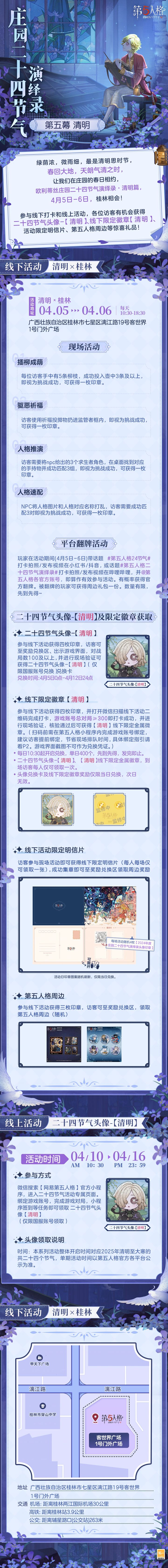 参与现场活动,各位访客有机会获得二十四节气头像-【清明】兑换卡、线下限量徽章【清明】、线下活动限定明信片、第五人格周边等丰富奖励~