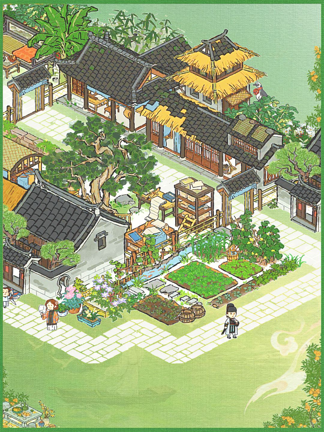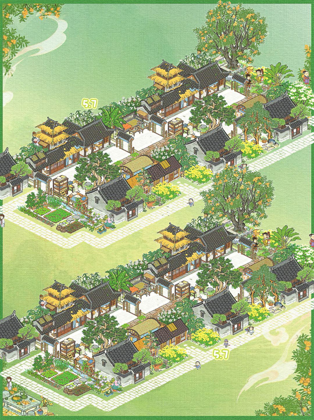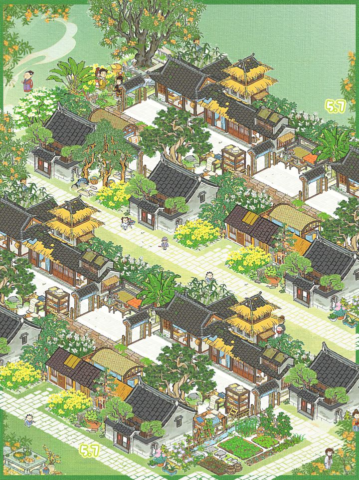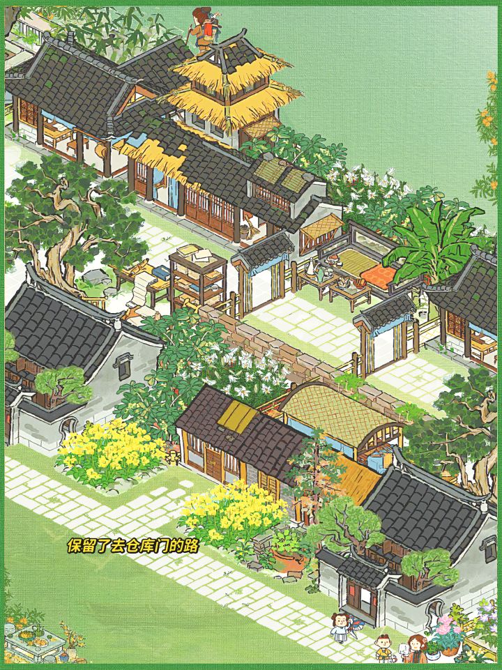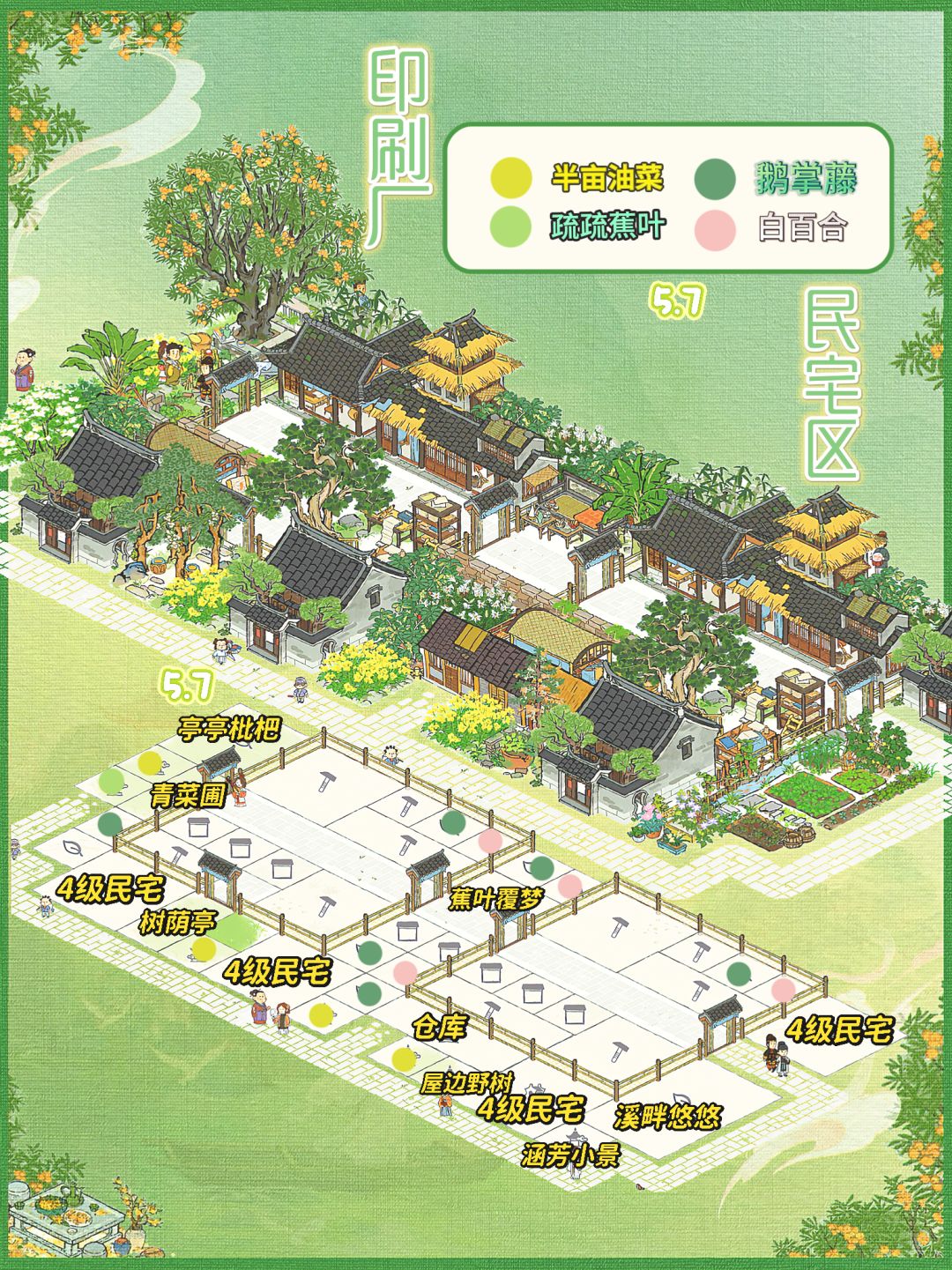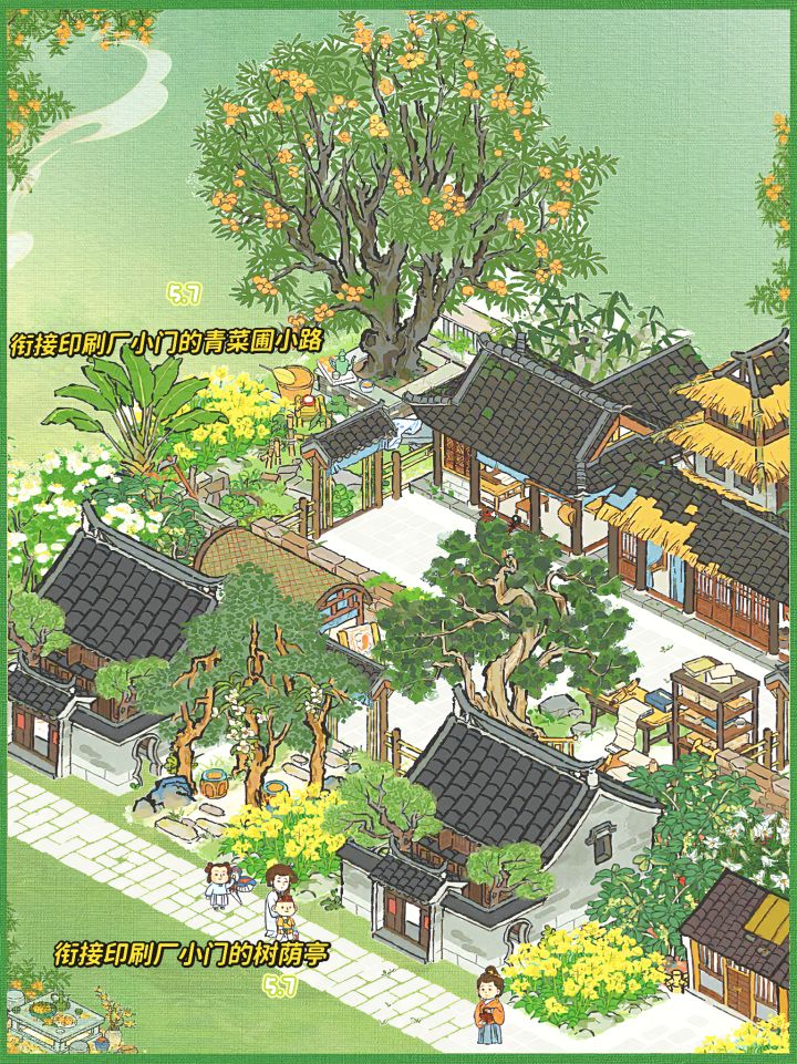 💚建筑:印刷厂(年历+经书)、4个民宅、一个仓库、亭亭枇杷、溪畔悠悠、树荫亭、青菜圃、半亩油菜、蕉叶覆梦、疏疏蕉叶