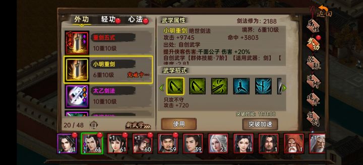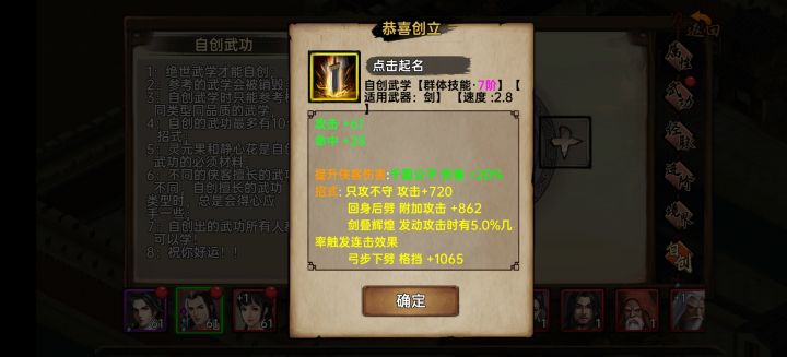 零氪想要自创真是太不容易了,创号初始7天的红武奖励开出了倚天剑决,过年免费领的元宝在英雄宴饮出了无敌剑法,秘境任务奖励了重剑,八仙剑至今未出,本着零氪不要求太高,将就现有条件进行了自创,自创只出了两条攻击外加附加攻击(附加攻击不加面值作用不大),速度就那样,预估10重10未精攻击大约为15300,比上不足,比下有余,只能将就用了。