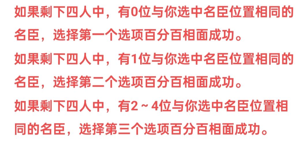 招募选择名臣为非许负外自己拥有的全部名臣。和时代无关,包括局内已经携带和清除的名臣,(大鹅,苌弘,吕雉消灭的),但是这几种者选择正确也无法再次获得。范围很大,想要特定刷名臣还是很困难的。