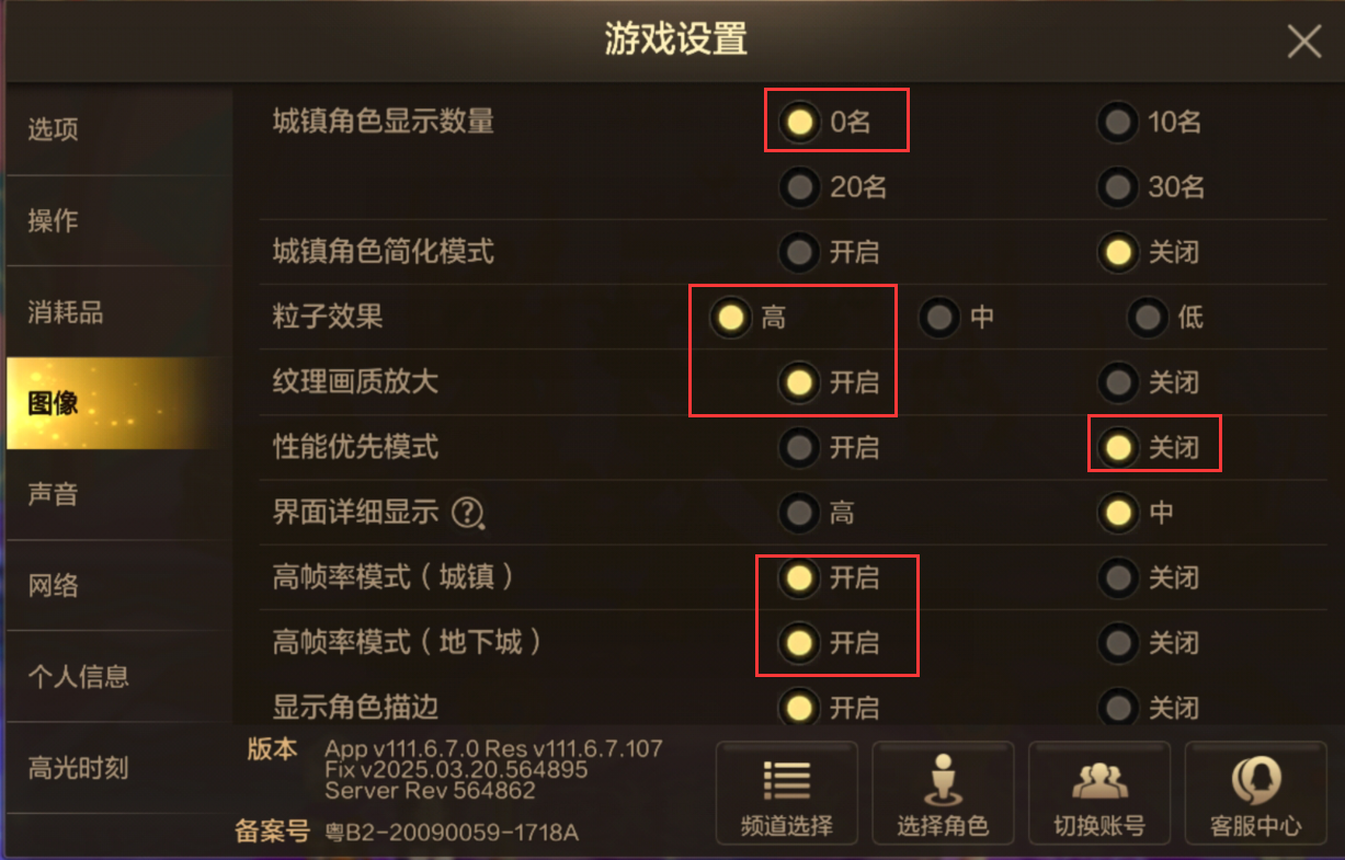 想要游戏画面更加流畅,在图像设置中可以将城镇角色数量设置为0,关闭性能优先模式,粒子效果设置为高,并开启纹理画质放大、高帧率模式。