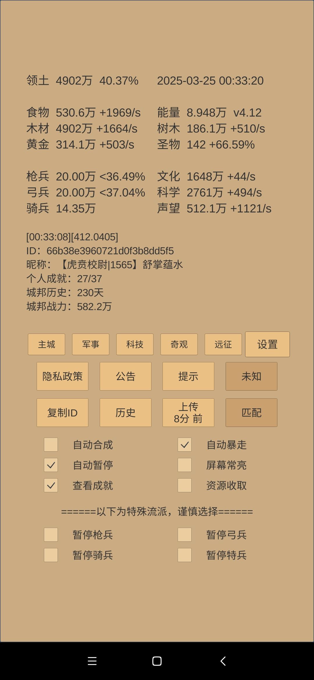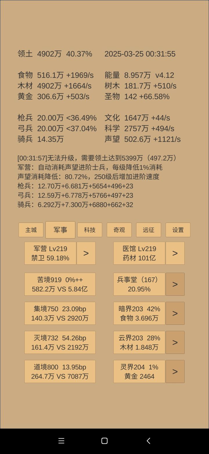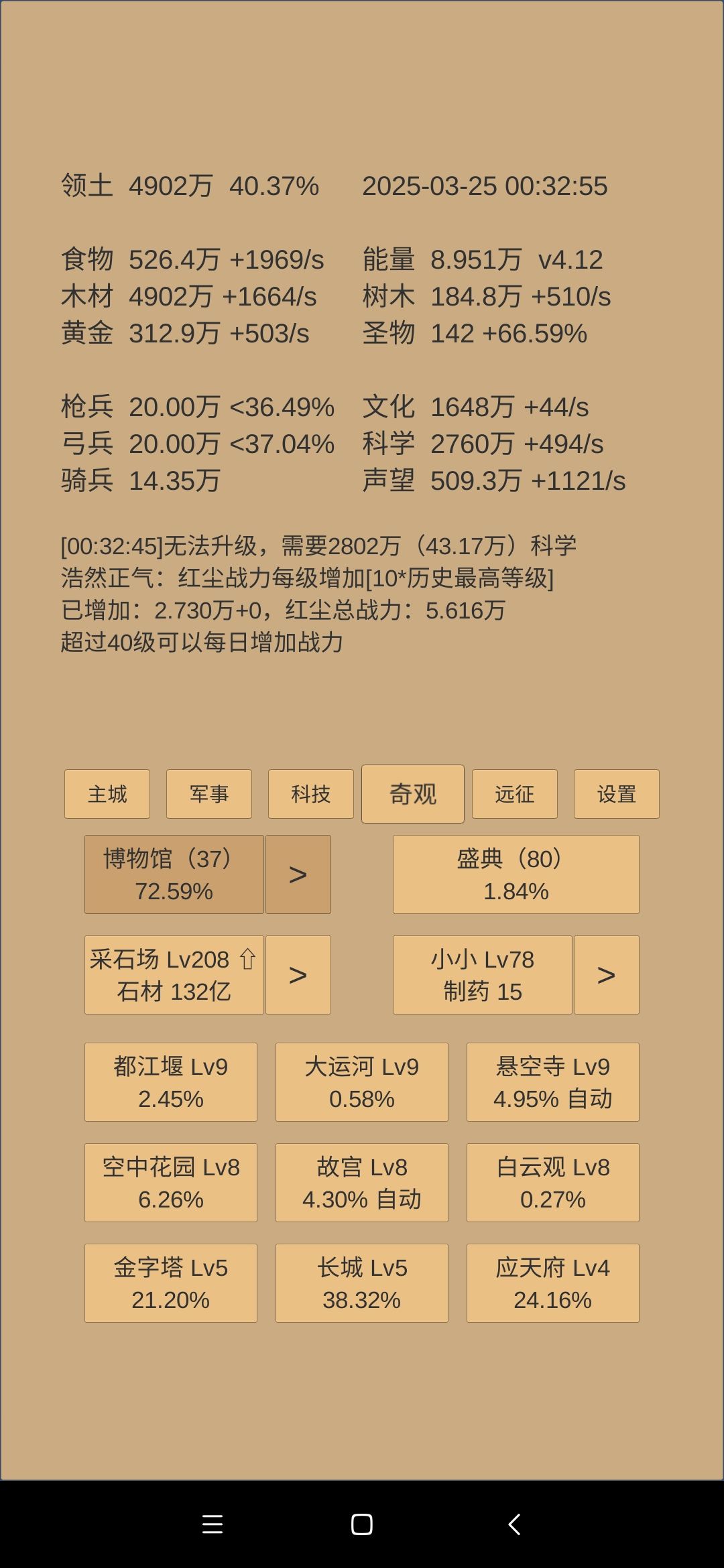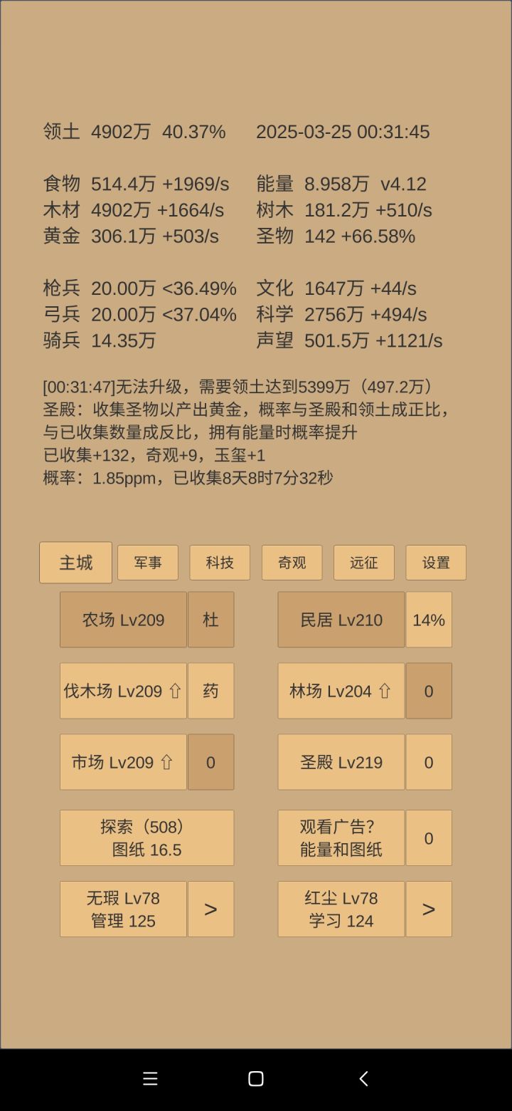 文化和奇观方面:继续升博物馆,马上建筑等级220,又能升民居提升一截黄金秒产。食物奇观搁置了,因为食物拿去换药了。木材奇观先升故宫,降低圣物收集系数,但是下一周期应该不能8升9。