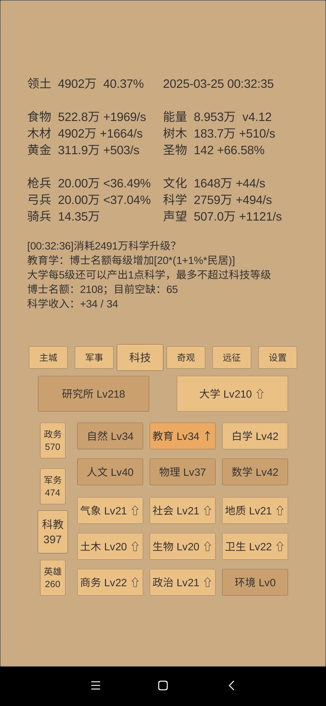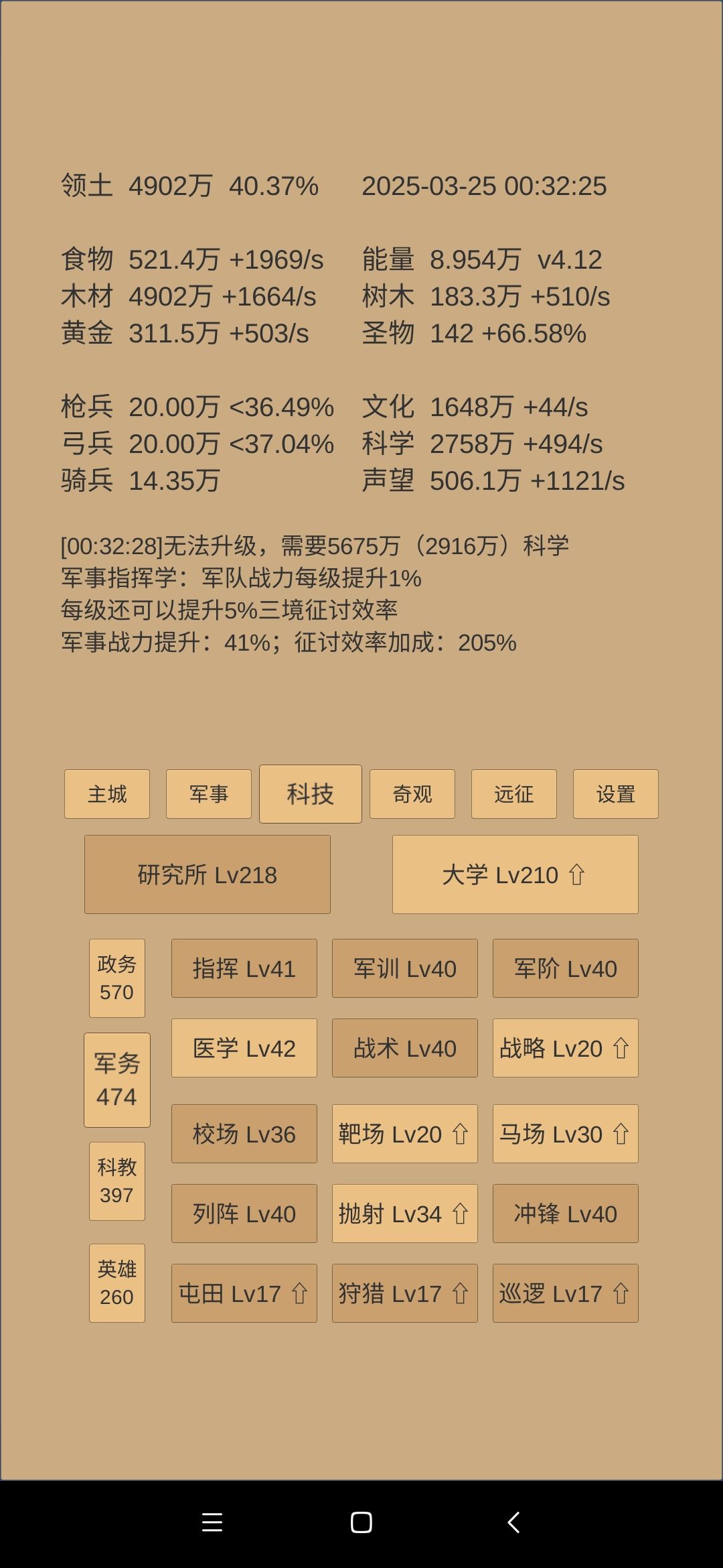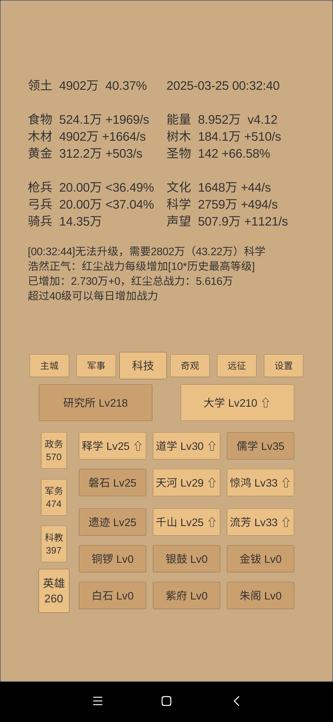科技方面,军事,军训,军阶拉到42,物理建筑拉到42,然后数学白学43,然后所有42的追一级到43,剩下还有多的科学,将会投入英雄斩业相关的科技,为转世铺垫打基础。