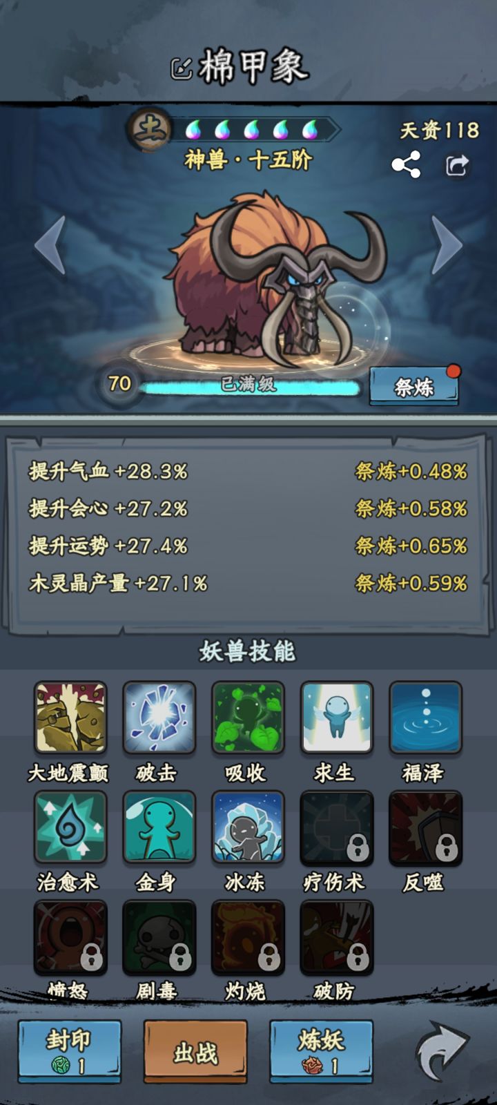 之所以大家都喜欢用大象,那是因为他的技能比较全面,获取方式也简单,很多新手玩家都不知道养什么妖兽的话,我建议你无脑养大象就对了,至于怎么养,是要看你用大象来干什么,分别为:PVP PVE,简单说就是(打人)和(打怪)大象满级是70级,满阶是15阶,四个词条,其中三个战斗词条一个经济词条,技能8个其中7个随机