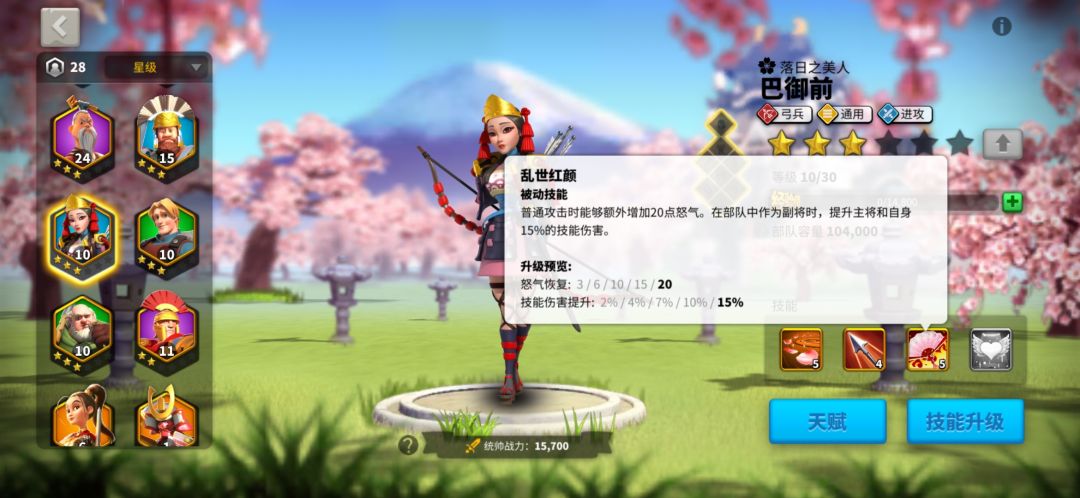 同时巴御前1技能加攻击力百分之30。3秒。2技能弓箭兵百分之5攻击加成。贞德弓箭兵百分之30攻击加成。(前面说了武将技能伤害是和部队攻击力挂钩的,攻击力越高技能伤害越高)