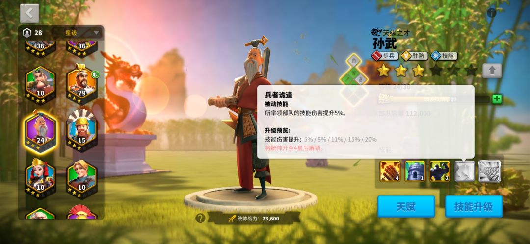 1技能所率部队攻击力百分之30,2技能也有百分之5的弓箭兵攻击加成,3技能每次普攻加20怒气,副将时加主将技能伤害百分之15。这对孙武技能流就非常舒服了。4技能大招是每次释放主动技能,当前作战对方减少百分之15伤害。因为这也是所有计算最后的减伤,所以比减少攻击力的效果更好。