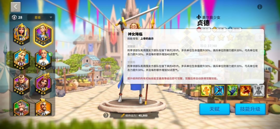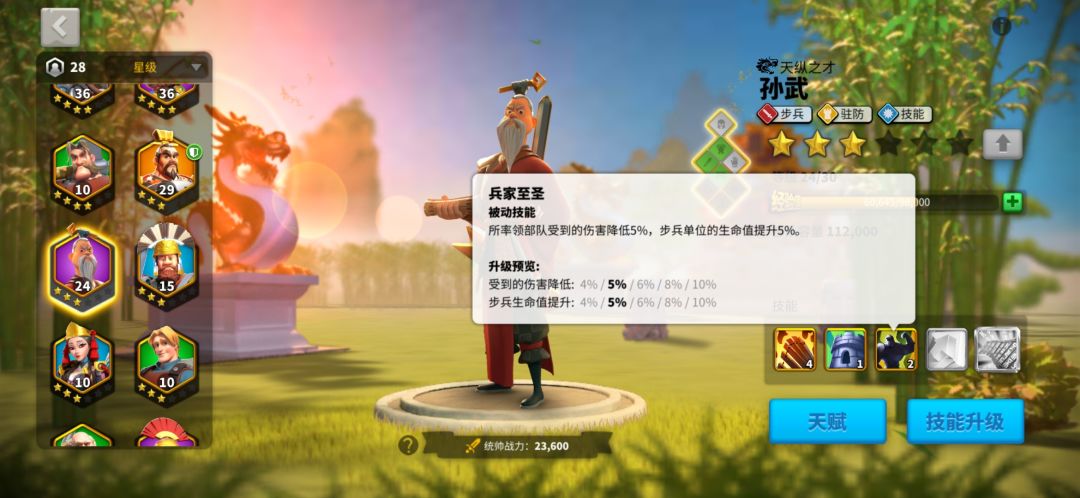 二技能所率部队百分之10,这百分之10是和你攻击力加成是乘法运算的。上面也说到过单支部队容量的重要性。