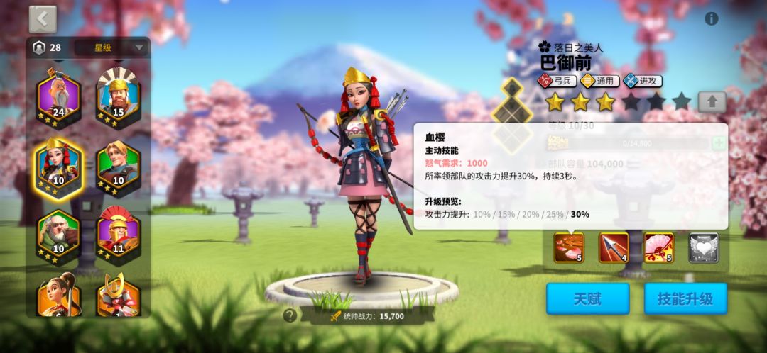 巴御前3技能加成主将技能百分之15,孙武自带技能加成20,还有孙武天赋还有一些加成。