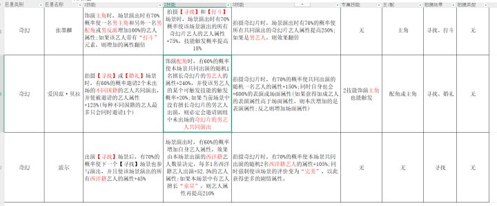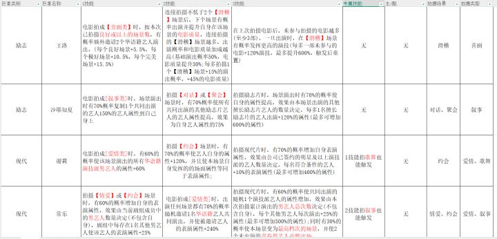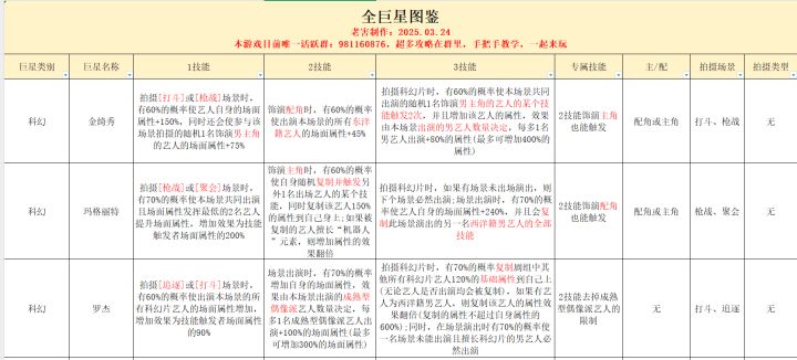 整理了目前69只巨星的技能以及能拍摄的场景,主配角等,有需要981160876,本游戏唯一活跃帬,自取