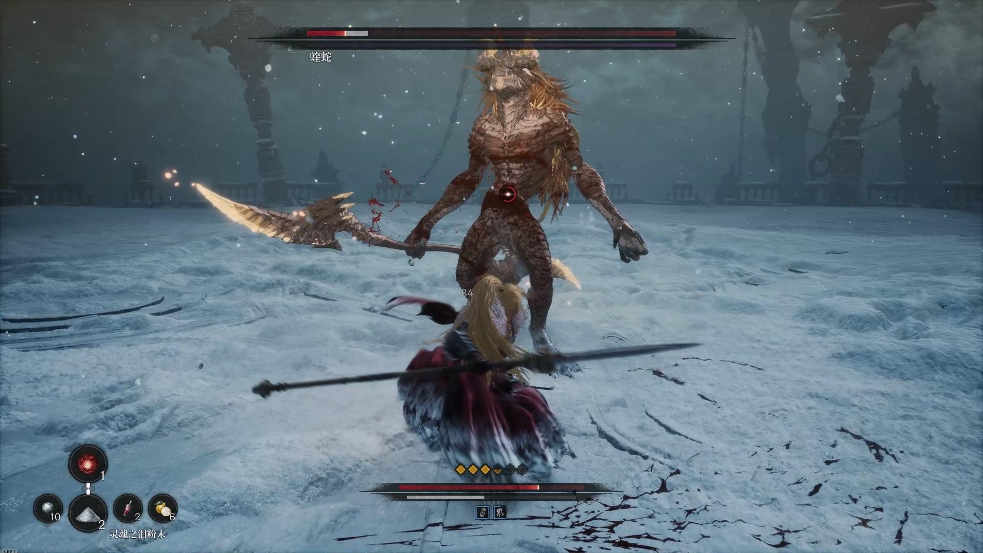 长枪是我使用时间最长的武器,不仅本身攻击距离就比较很长,点出「月光斩」等核心技能之后可以打出非常漂亮的连段伤害,甚至可以凭借轻攻击连击在精力打光之前压制部分 BOSS,从而显著降低战斗的难度。