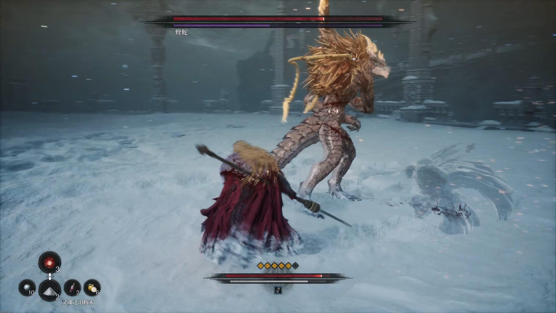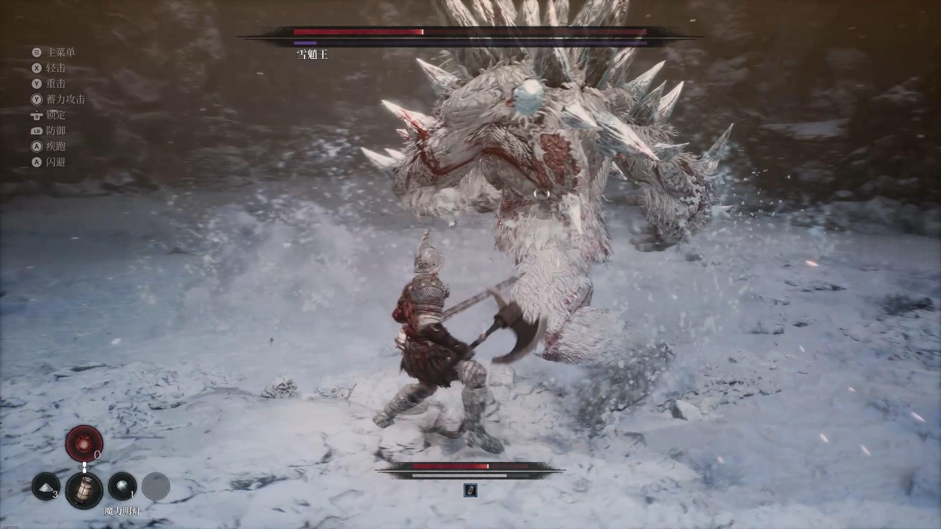 流程中的第一把武器刀+斧虽在形式上贴近「双刀」,但实际用起来依然具备一定的力量感,敏捷度在三把武器中排第二,点出一些回精力的招式之后可以打得十分有效率,角色位移幅度大、连续攻击特性强。