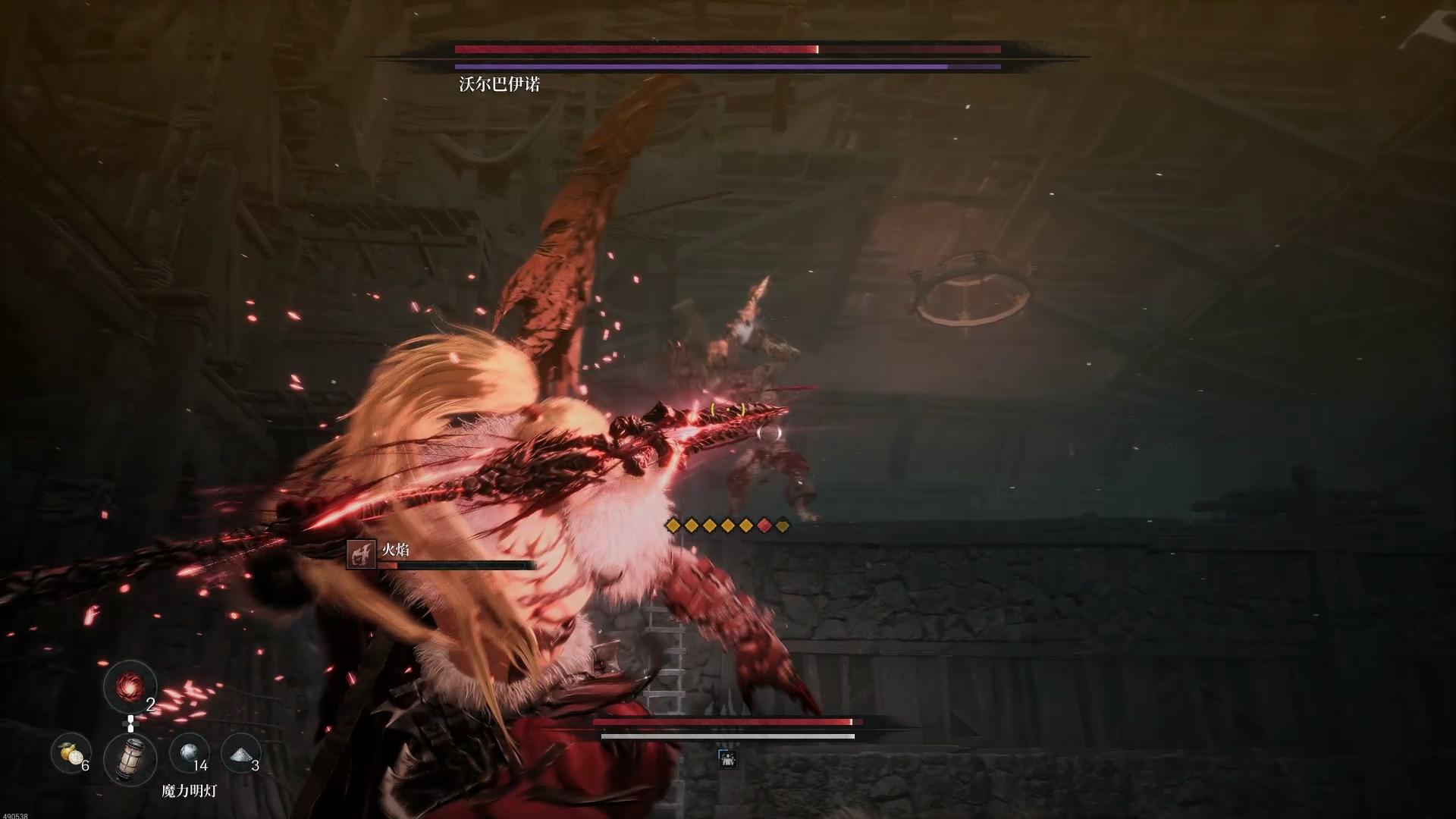 除此之外,游戏里的普攻虽然要消耗精力,但技能并不会。技能资源在游戏中叫「斗志」,是血条上方一颗一颗连在一起的黄色菱形方块,一般在战斗过程中能够逐渐积累,发动标枪、战斗技能时会消耗 1 颗或是更多。