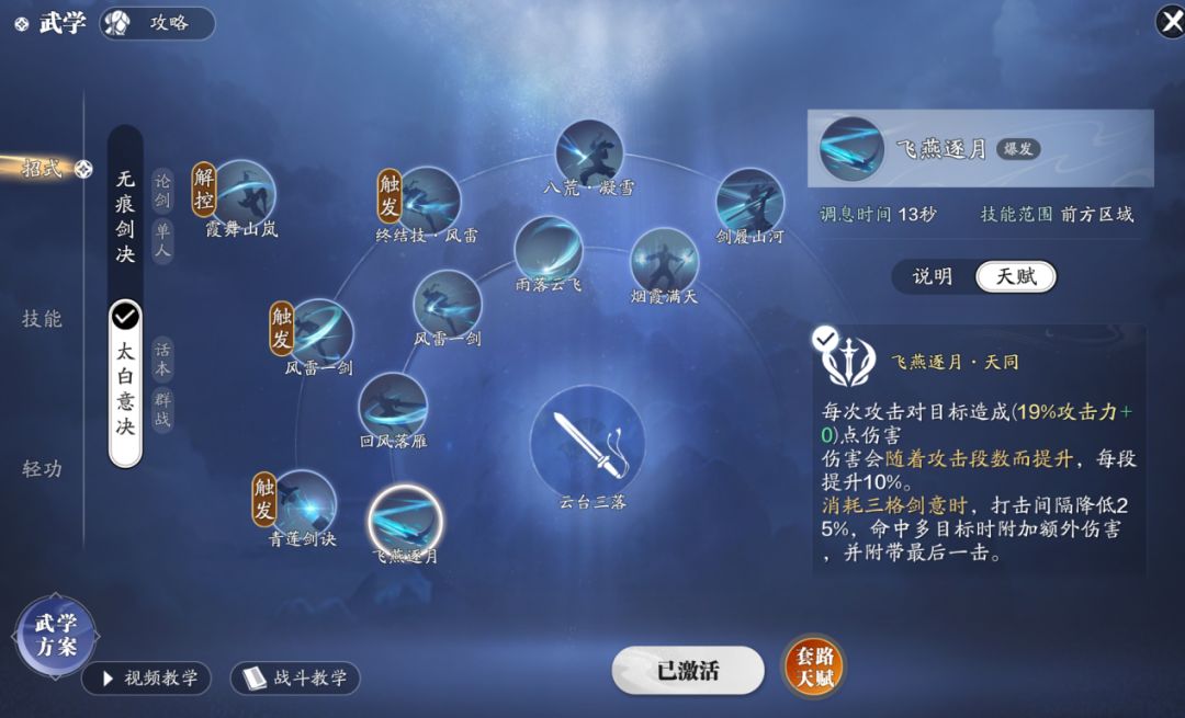 一技能飞燕逐月消耗三格剑意会有额外伤害,所以要保证至少有三格剑意时释放飞燕逐月哦