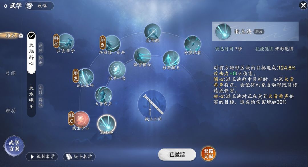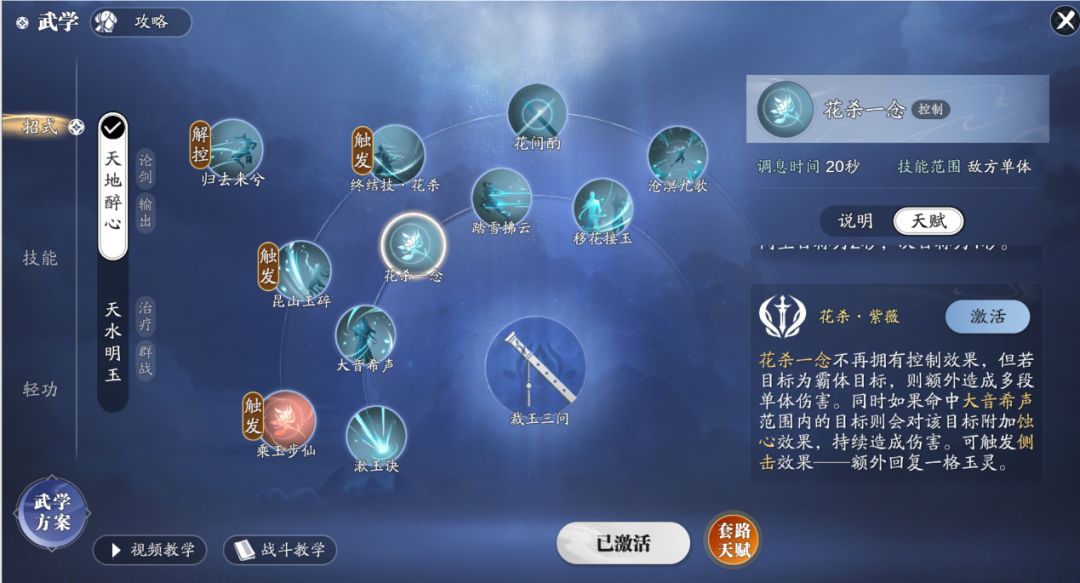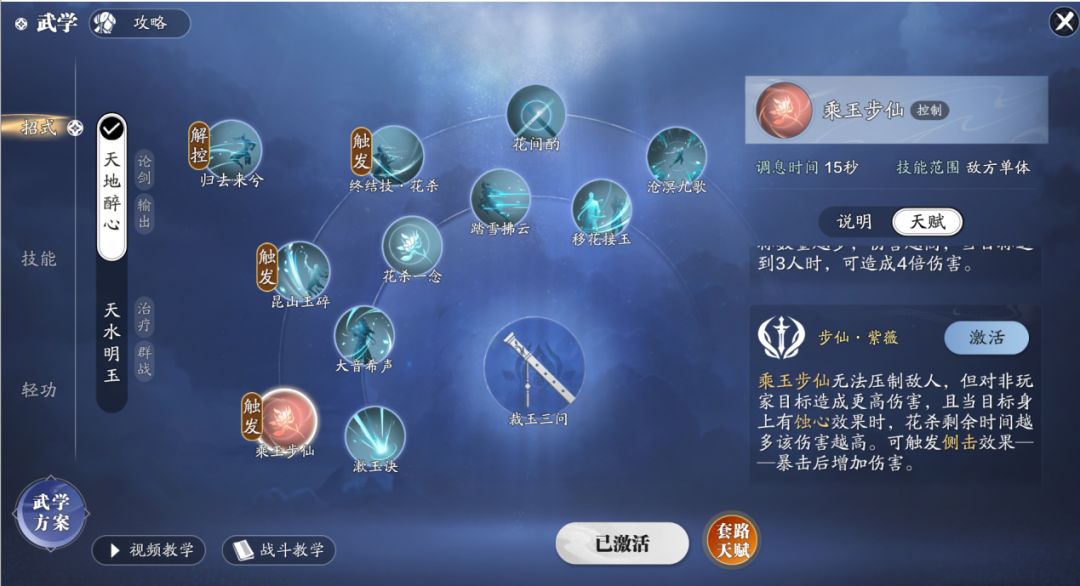 三技能花杀一念如果命中二技能大音希声范围内的目标就会对该目标附加蚀心效果,此时再使用乘步玉仙技能就会打出额外伤害。