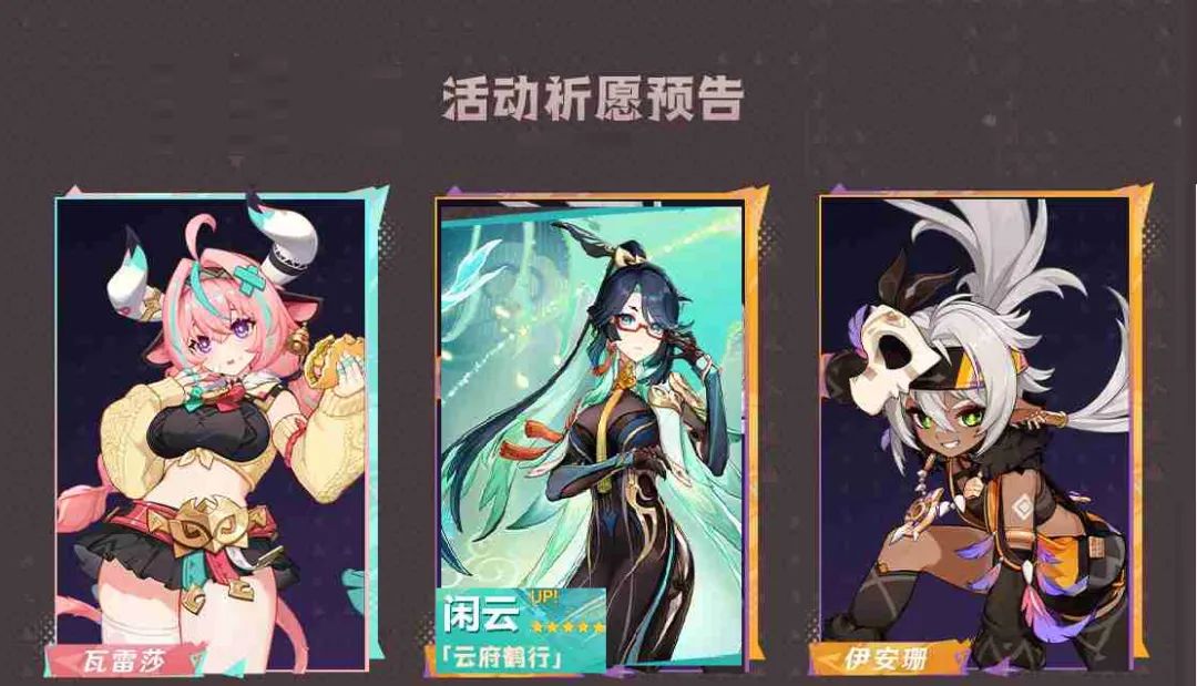 卡池角色:瓦雷莎(五星雷系法器主C)、闲云(五星)、伊安珊(四星雷系长枪辅助)