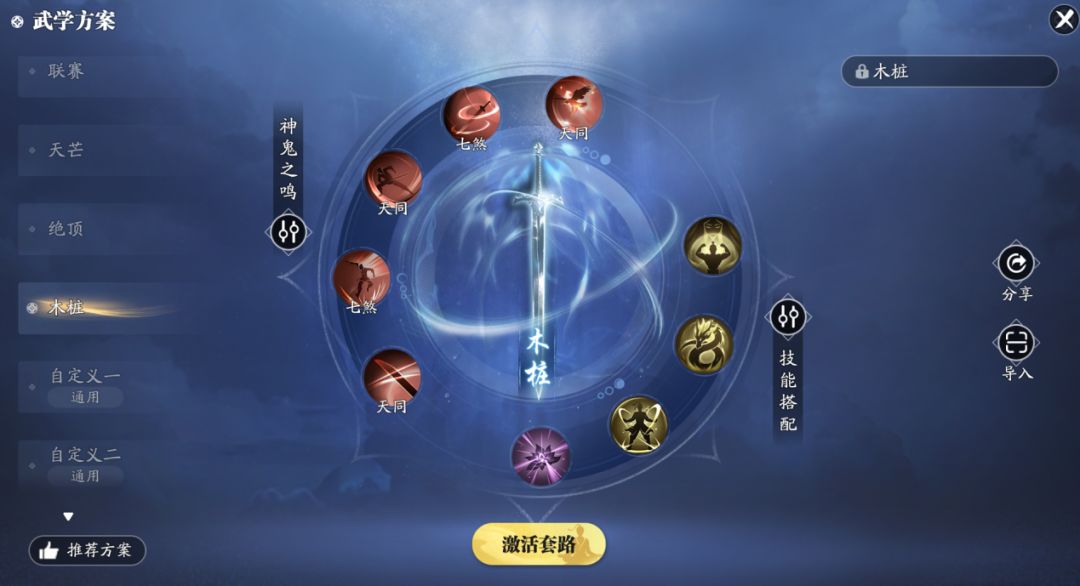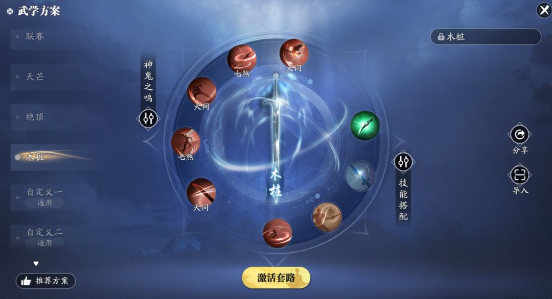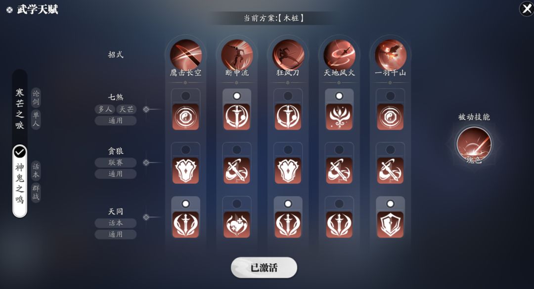 神刀输出天赋有两套:第一套为全部话本天同天赋,第二套为风雷一剑技能选七煞天赋,其他选话本天同天赋,在这里推荐第二套全部话本天同天赋,伤害会更高。
