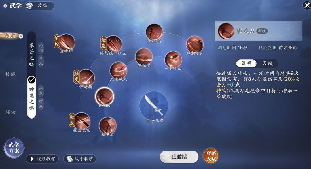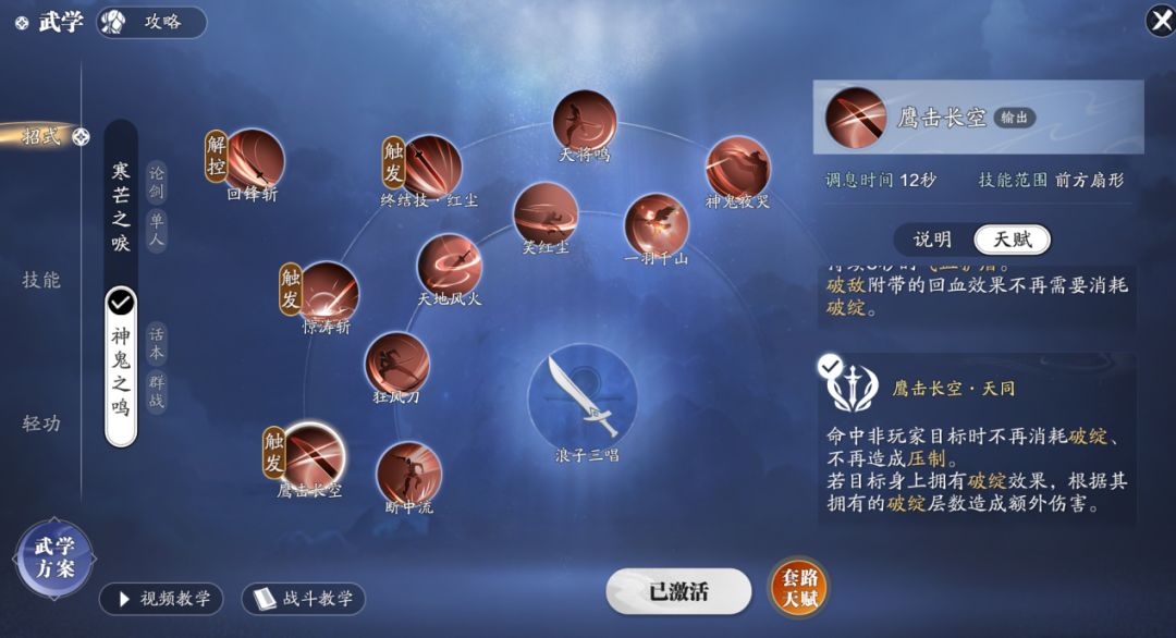 神刀的破绽效果能使鹰击长空技能造成额外伤害。二技能狂风刀和四技能笑红尘都能使敌人目标附加一层破绽,所以在输出时,我们要尽量保证鹰击长空技能放在二技能狂风刀和四技能笑红尘后面。