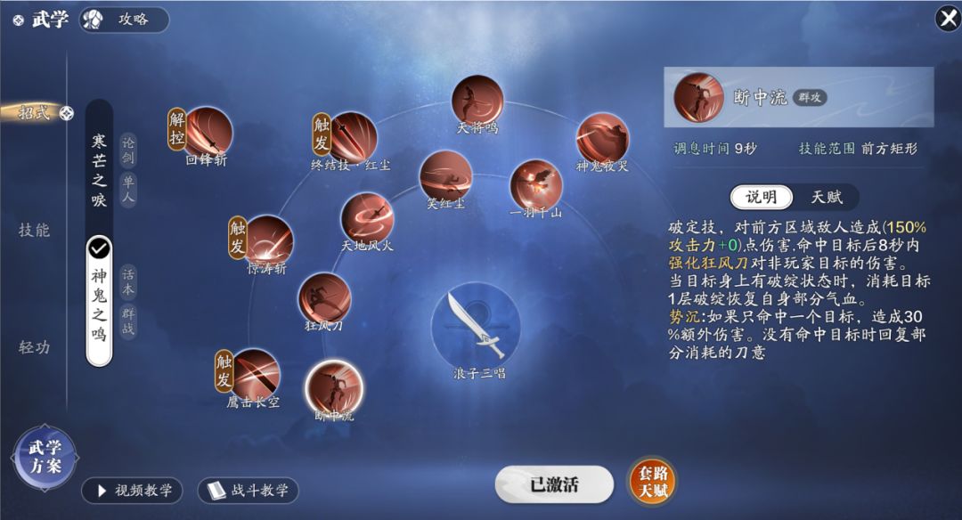 神刀的一技能断中流命中目标后8秒内强化狂风刀对非玩家目标的伤害,所以我们一定要放完一技能断中流后再放二技能狂风刀,使输出最大化。
