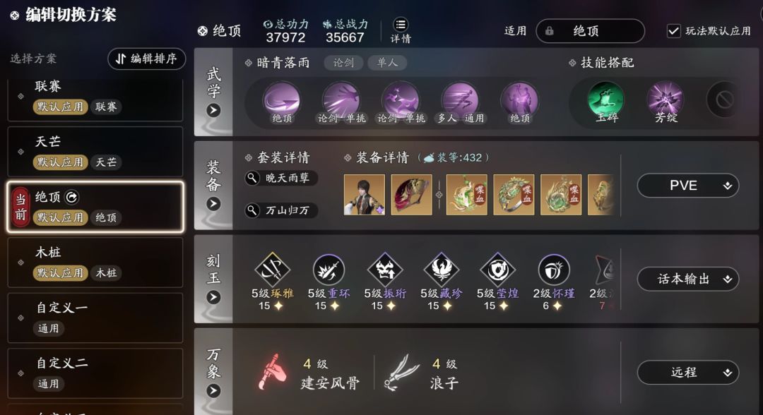 进入秘境后,方案会自动切换为绝顶方案,所以各位少侠记得在绝顶方案里把副本装备,副本刻玉,卡牌技能都带上哦。