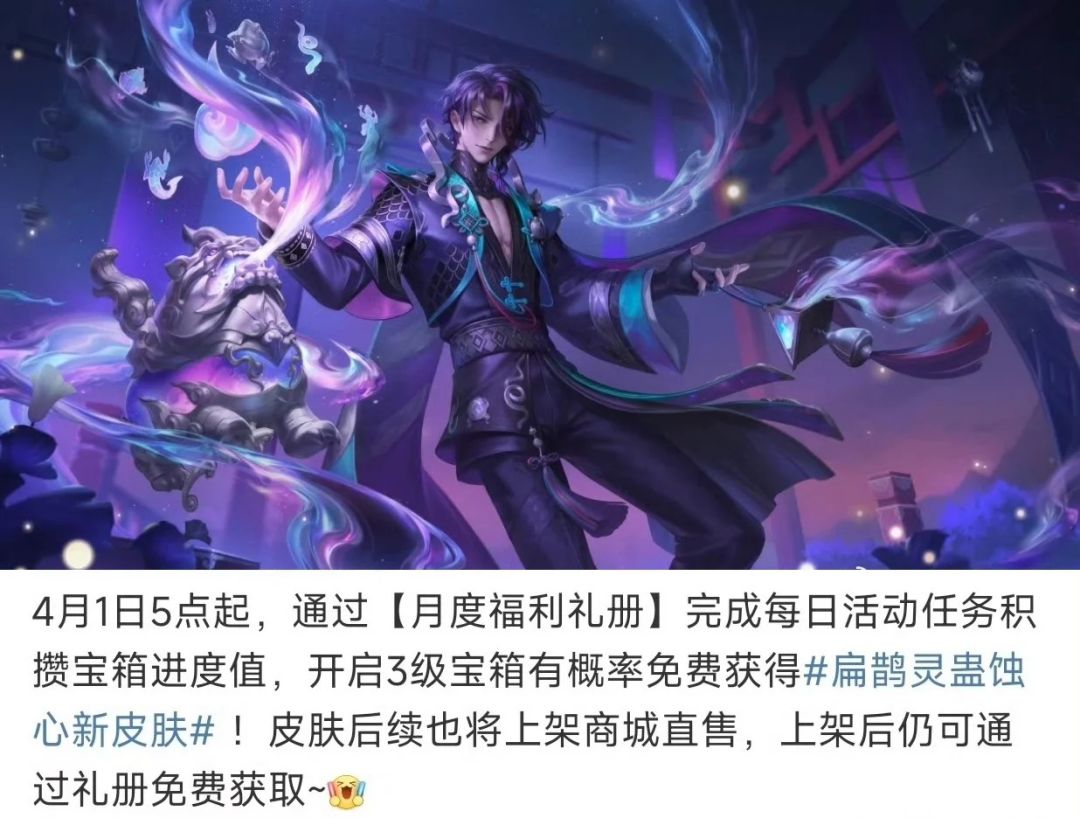 开启3级宝箱有概率免费获得扁鹊灵蛊蚀心新皮肤!