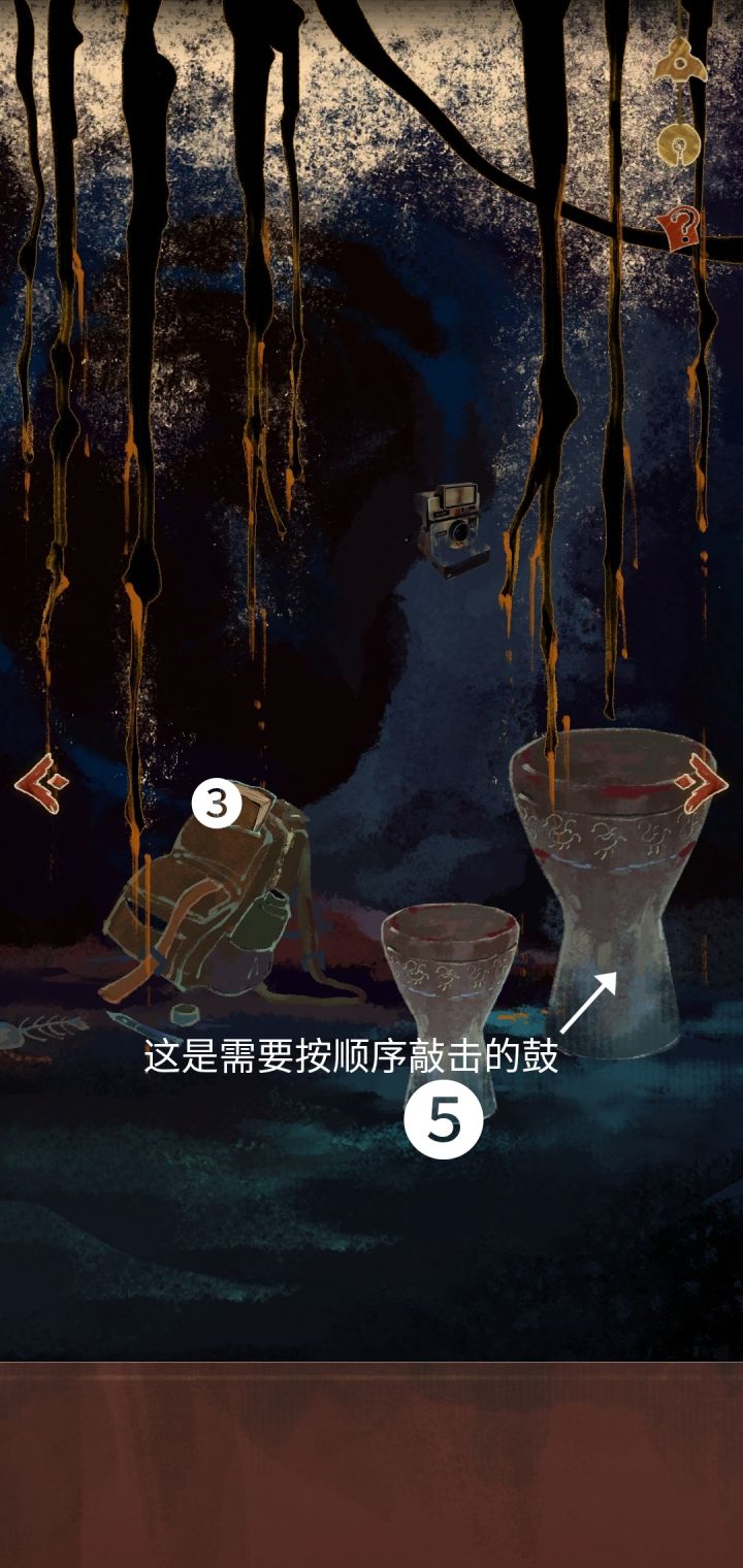 ①玉钺,上面是⑤鼓的敲击顺序(大黄 小红 小黄 小黑 大绿 小绿 大黑)去鼓那里按上述顺序敲击,回到①拿到玉钺