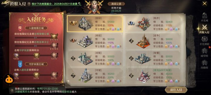 跨服入侵,每周的星期二开启,有四个任务,达到分数可以领取宝箱,可找人互刷,或者等晚上9.30激战公爵开始,顺便完成守护和入侵任务,公爵分两轮,如果第一轮是自己服可先去守护公爵完成守护任务,等到第二轮再去打公爵,反之则先去其他服打公爵,第二轮回家守护