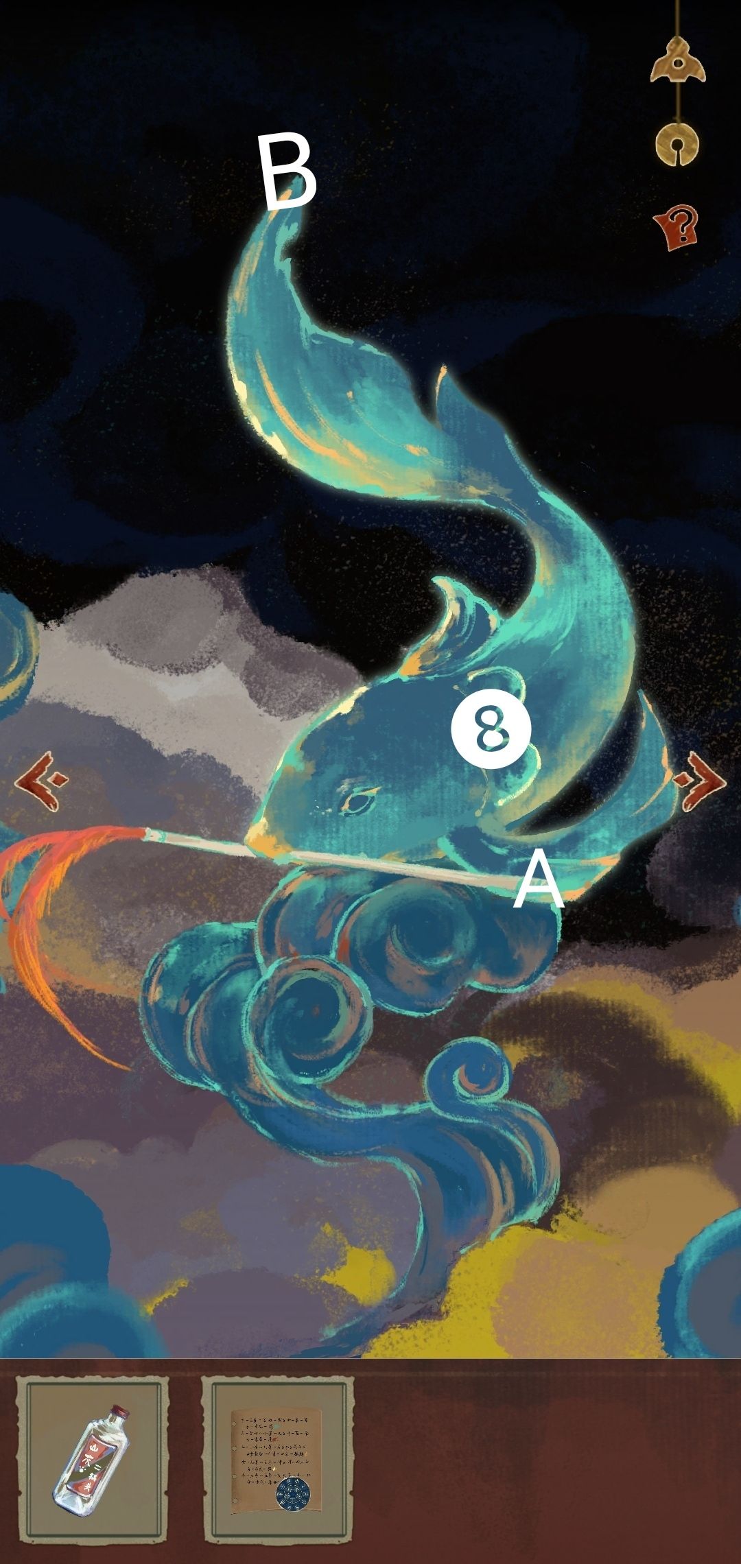 获得箭头,放入A鱼箭头丢失 白框处,获得蝴蝶B,放在红色花C处,过渡动画。再次点击鱼尾B处,根据p6顺时针颜色为(绿 红 土黄 浅黄 蓝)