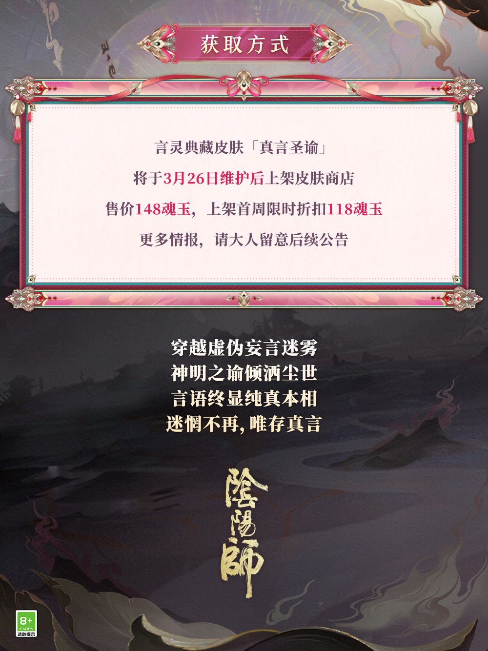 △言灵全新典藏皮肤「真言圣谕」将于3月26日维护后上架皮肤商店,售价148魂玉,上架首周限时折扣118魂玉。