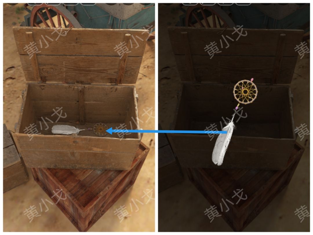 28.点击地上的箱子,根据各个场景骷髅羊头上的风铃的羽毛数量和羊角的姿势,调整密码锁