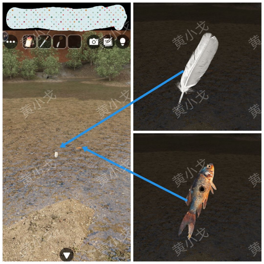 22.点击拾取小溪里的【羽毛】和【鱼】