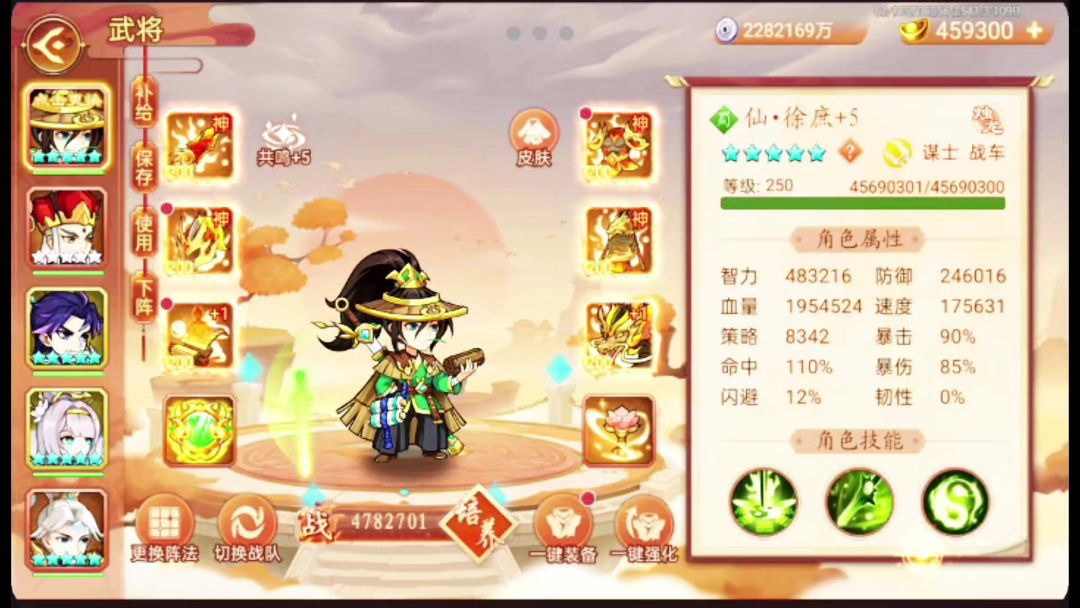 装备配置:这里用的是洪荒四件套+玄黄剑,个人感觉烛龙六件套陨练到神应该也是能打的。(自行把徐庶辛妹共鸣升高即可,这里用的是+5共鸣徐庶和+3共鸣辛妹)