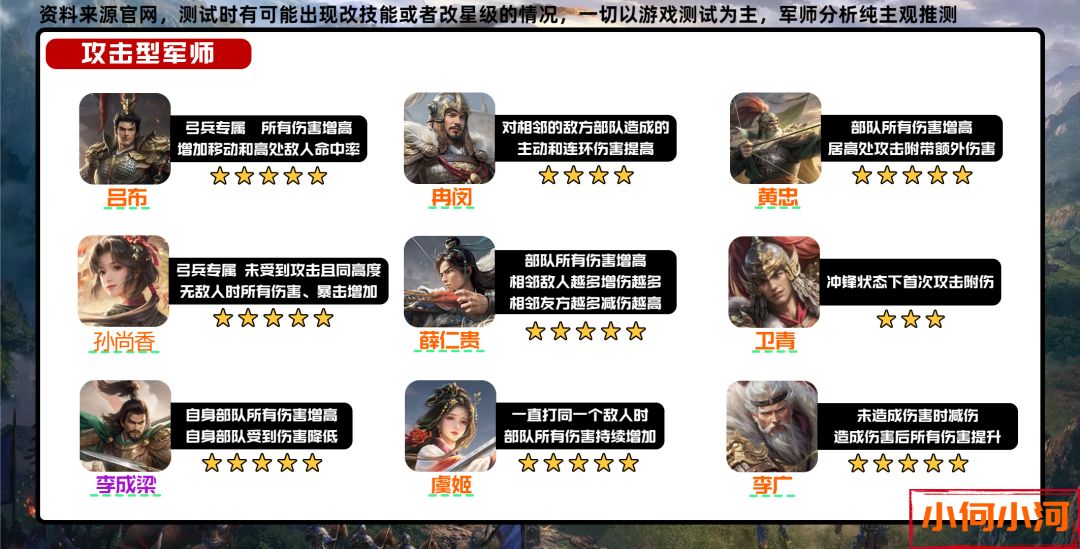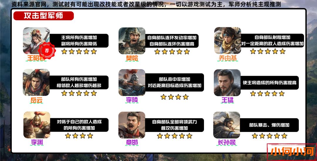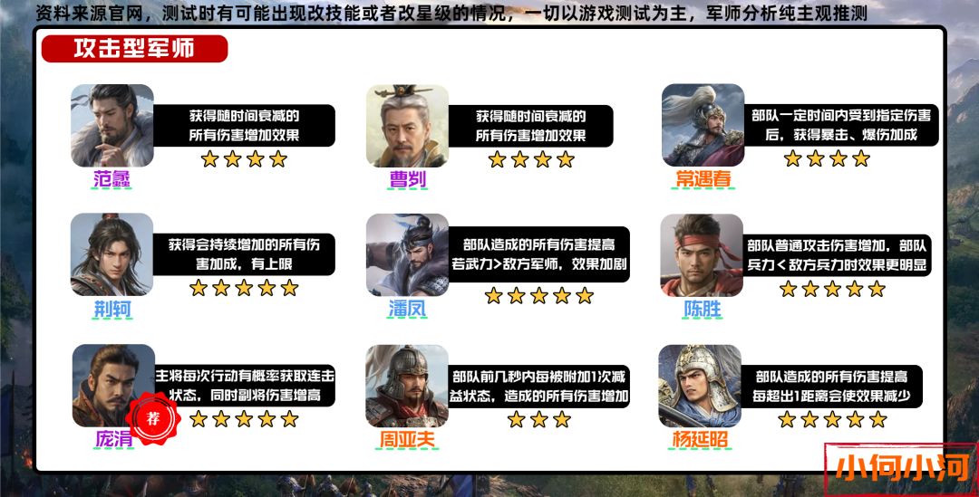 所以这篇就开始讲一下军师,首先是指路环节:军师篇也会分为输出、防御和功能型三章,这次的一图流针对每个将领都有主观的推荐,这个推荐满星为五星,由于不知道具体数值,只能通过介绍大致主观的评级,并且评级结合将领的星级,有些三四星的将领技能介绍可能不如五星将领,但由于容易获取等性质可能评分会比五星高