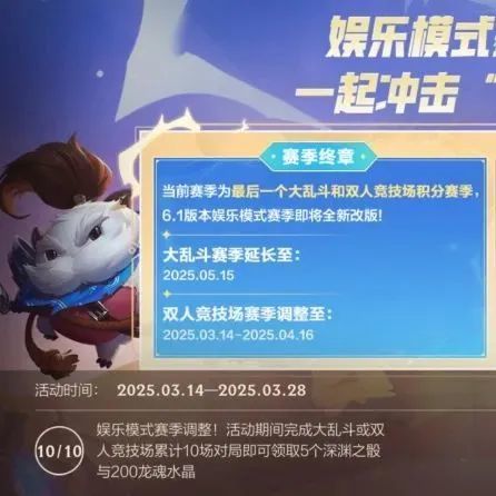 娱乐模式赛季调整,一起冲击“终章奖励”!截止至3月28日,召唤师完成大乱斗或双人竞技场累计10场对局,即可领取深渊之骰*5与龙魂水晶*200奖励~