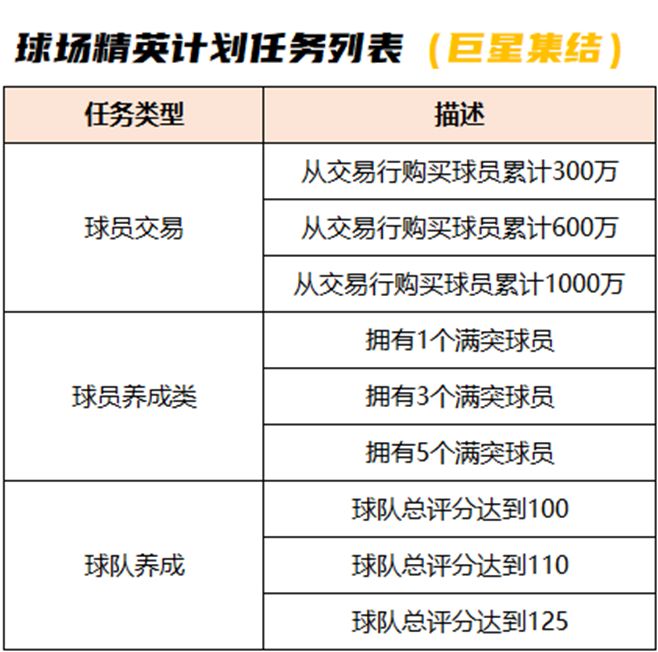 【崭露头角】主打累计活跃,具体任务如下表所示,只要保证开服后,每天赢得5场比赛的胜利,12天就能完成所有任务。建议比赛可以使用经理人模式完成(前提是玩家等级达到10级)。