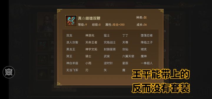 还有,关于关兴张苞,你既然基础特技和万人斩成就特技都是根据父辈来的,那关张的套装就算你触发不了套装效果,你至少得能用吧?结果你们倒好,不转职之前还能用,转职过后反而带不上了,简直简直了!