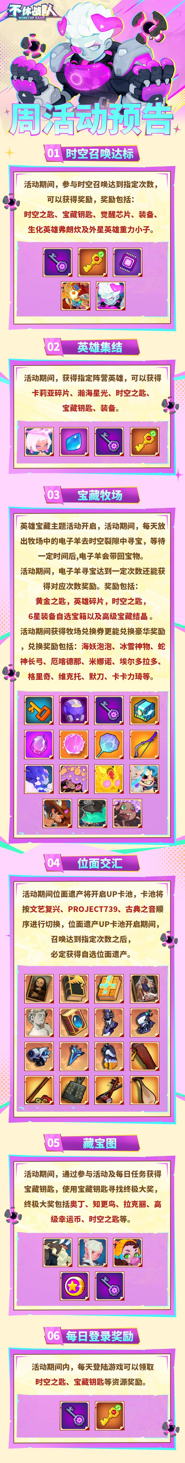 ③宝藏牧场:英雄宝藏主题活动开启,活动期间,每天放出牧场中的电子羊去时空裂隙中寻宝,等待一定时间后,电子羊会带回宝物。活动期间,电子羊寻宝达到一定次数还能获得对应次数奖励。奖励包括:黄金之匙,英雄碎片,时空之匙,6星装备自选宝箱以及高级宝藏结晶 。活动期间获得牧场兑换券更能兑换豪华奖励,兑换奖励包括:海妖泡泡、冰雪神物、蛇神长弓、厄喀德那、米娜诺、埃尔多拉多、格里奇、维克托、默刀、卡卡力琦等。