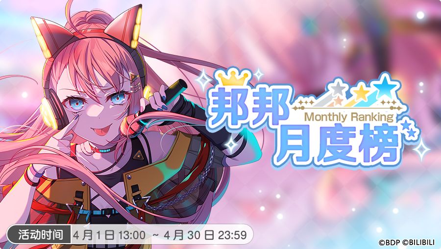 游戏内现已开启4月【邦邦月度榜】,通过完成演出将可获得「邦邦月度榜Pt」,根据当月获得的「邦邦月度榜Pt」,可由「青铜段位」依次升至「白银段位」、「黄金段位」和「铂金段位」,到达对应段位后将获得该段位的奖励!