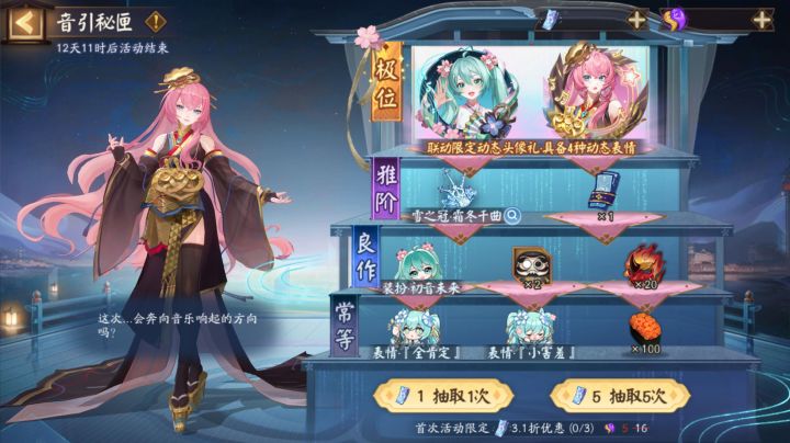 ※活动期间,大人购买「音舞礼券」参与「音引秘匣」活动,消耗「音舞礼券」抽奖将会随机获得常等~极位任意档位的奖励!有机会获得咏音幻奏·初音未来动态头像礼、音叠百景·巡音流歌动态头像礼、「霜冬千曲」专属配饰·雪之冠、装扮·初音未来、初音未来表情「全肯定」及「小害羞」等超多奖励!