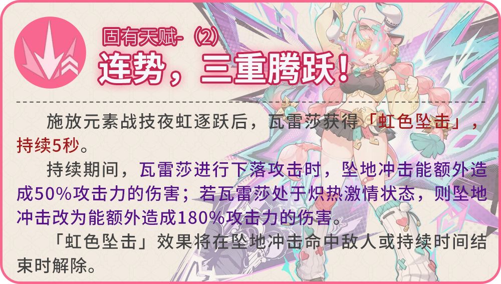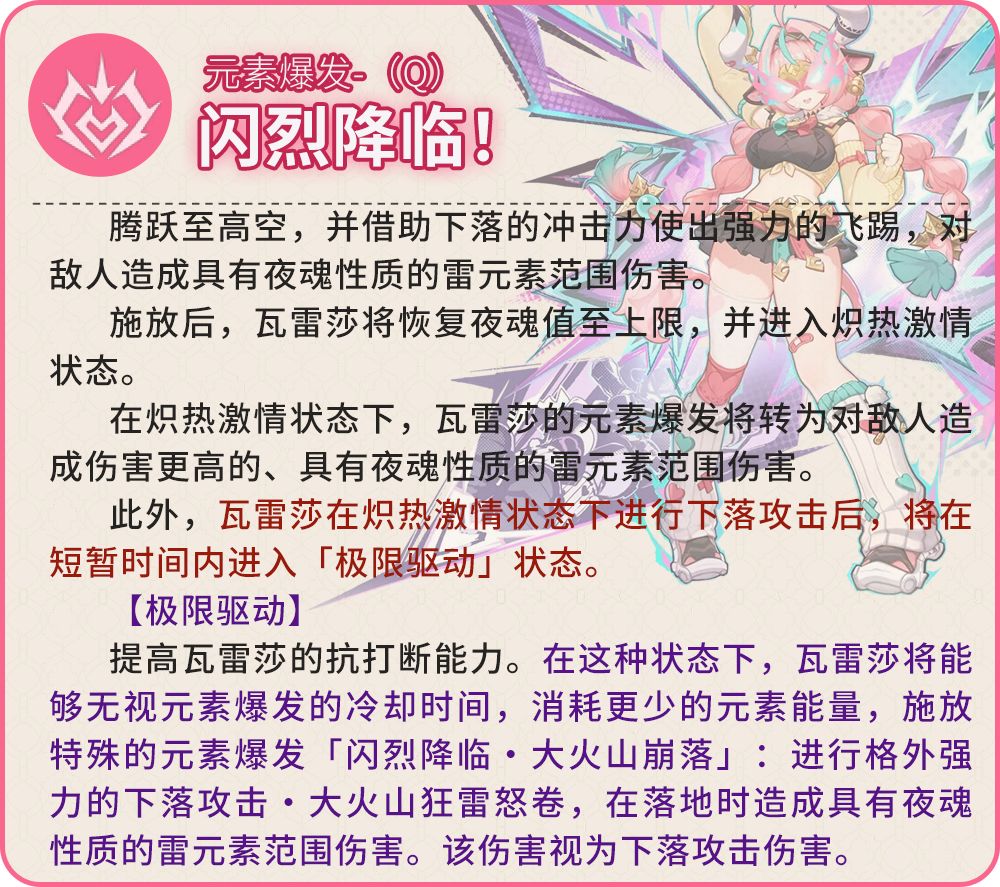 施放元素爆发闪烈降临!时,依据瓦雷莎的状态,将分别产生对应的强化效果。若瓦雷莎:·不处于炽热激情状态或极限驱动状态:瓦雷莎获得「精进勇猛」效果,持续15秒,基于瓦雷莎攻击力的500%,提升瓦雷莎进行下落攻击时坠地冲击造成的伤害,至多通过这种方式提升20000;该效果将在坠地冲击命中敌人或持续时间结束时解除。·处于炽热激情状态或极限驱动状态:本次元素爆发闪烈降临!造成的伤害提升100%。