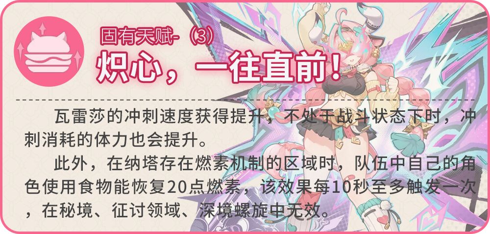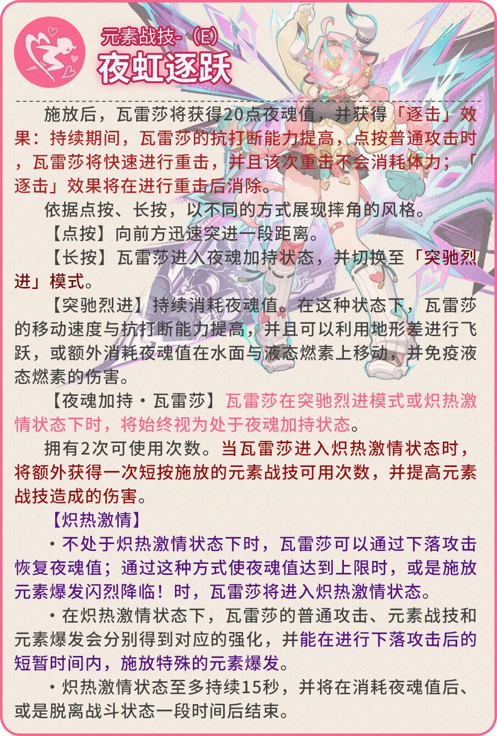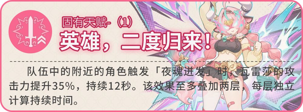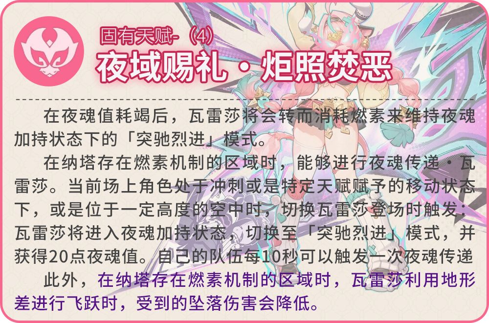 进入极限驱动状态时,将为瓦雷莎恢复30点元素能量。瓦雷莎的下落攻击与元素爆发闪烈降临!的暴击率提升10%,暴击伤害提升100%。此外,瓦雷莎长按施放元素战技夜虹逐跃时,或是在「突驰烈进」模式下点按施放元素战技时,瓦雷莎将恢复夜魂值至上限。