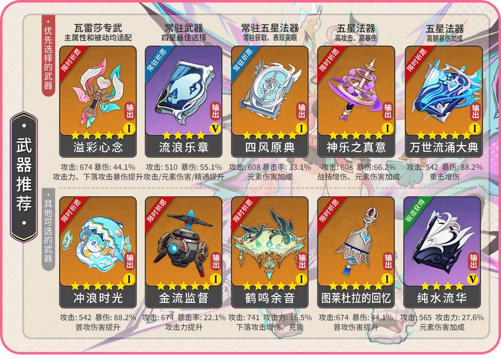 此外,需要说明的是闲云专武“鹤鸣余音”虽被动均适配瓦雷莎,因缺乏双暴主词条加成,伤害并不是尽如人意,但依旧可作为下为替代武器使用;四星武器“流浪乐章”在赌到被动非精通加成的情况下均表现亮眼,仅次于专武,为四星最佳!