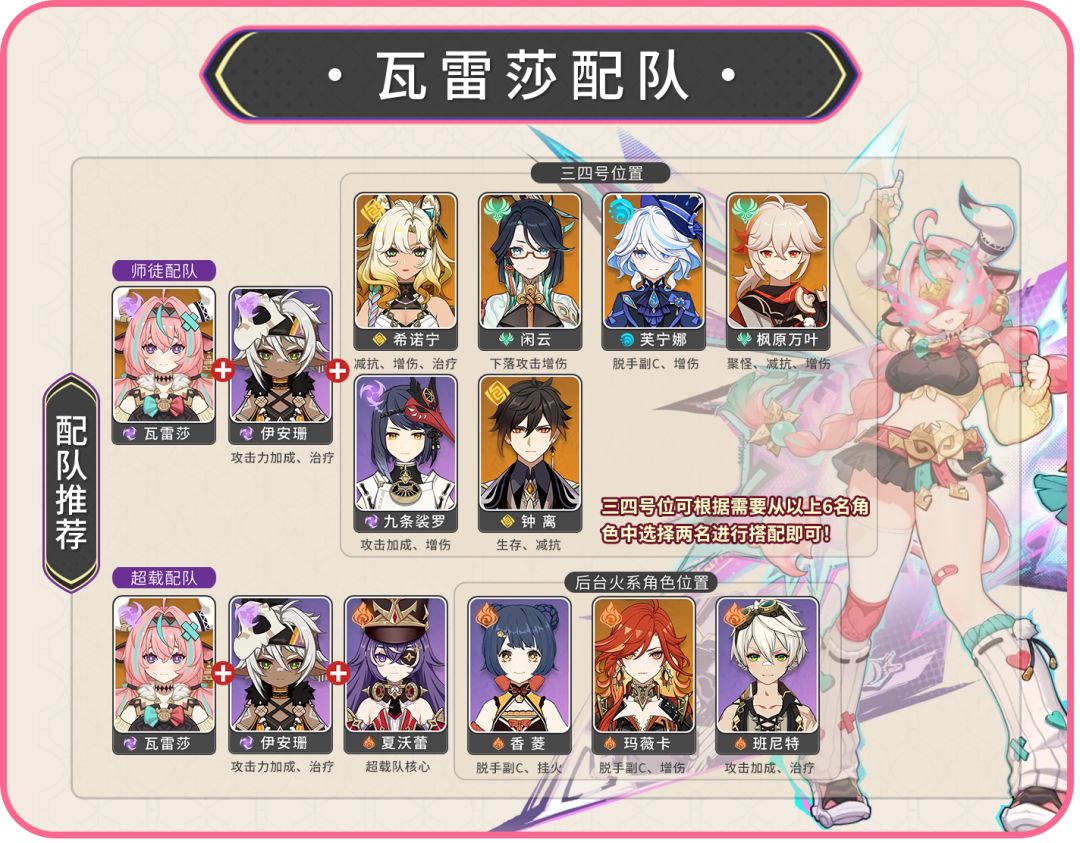 (2) “瓦雷莎+伊安珊”的师徒组合在除了抗性乘区之外的其他乘区均已筑起高墙,因此,瓦雷莎队友可以加入抗性乘区辅助的考虑,如风套风系角色、希诺宁、钟离等,适配性很好!