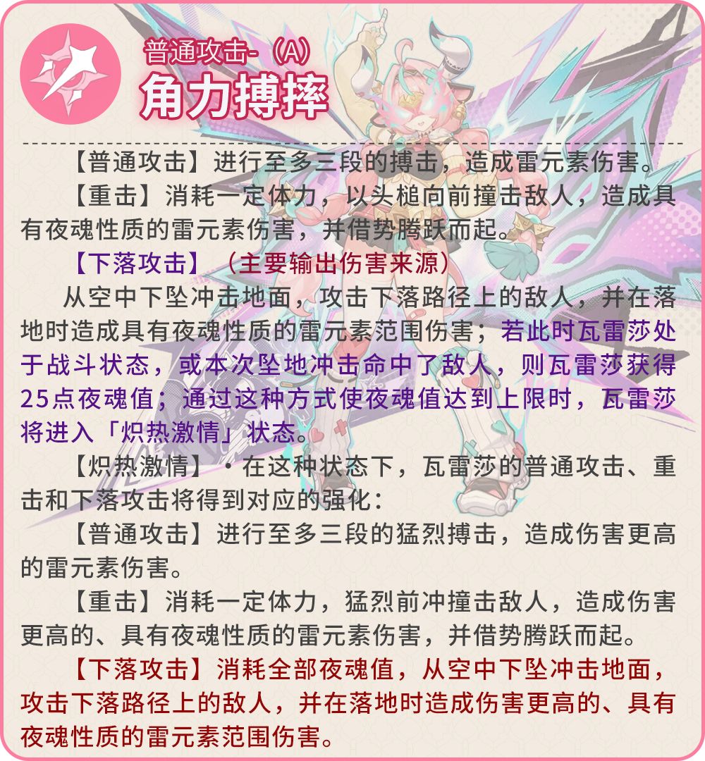 无论是否处于炽热激情状态,瓦雷莎进行下落攻击后,都会进入极限驱动状态。处于极限驱动状态下时,瓦雷莎的抗打断能力还会进一步提升。此外,瓦雷莎进行下落攻击时的坠地冲击命中敌人时,会为瓦雷莎恢复11.5点元素能量。