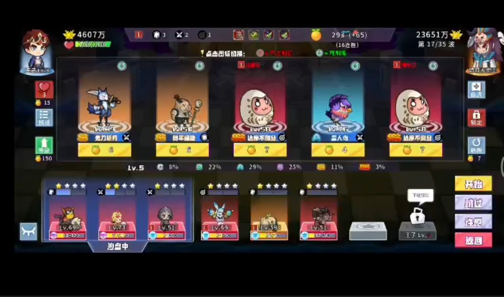 打到第9波大概有370橙子,确保手上至少有两个三星0卡 白卡(没有就刷新几下),开125然后只留那俩白卡+一酱油,赌 拆迁 / 侦探 / 爆炒 / 886 / 鸡(用的少),拿一个主力下来,有多的就锁住,用卷给主力升三星,卷多可以锁垫子博四星,如下图,卷少可以忽略,欧皇局可以忽略