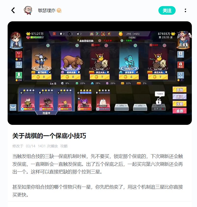 以往中期过度的思路是,第9波开125格子然后赌红卡,红卡升三星或者四星,吃经验到史诗传说,然后再依次培养第二第三个主力。主力成型后凑组合技。现在有了这个技巧,可以转换思路,做个假设,我们正在冲比较极限的关卡,刷到了终极自曝+血量,分别是侦探+一紫卡+俩橙卡,第九波其他三个都出了就剩个侦探,按照以往的做法,那三个肯定只锁不拿,但是现在我们大胆拿,然后用保底给侦探刷三星,卖掉手里的白卡给侦探升到史诗,三星史诗侦探+自曝有个两三亿的战力,完全可以打到15~20波,升传说以后还能继续打,这一下就能攒下很多橙子,较之前减少了许多运营的压力。中间出了主力卡或者组合技卡, 记得锁住。